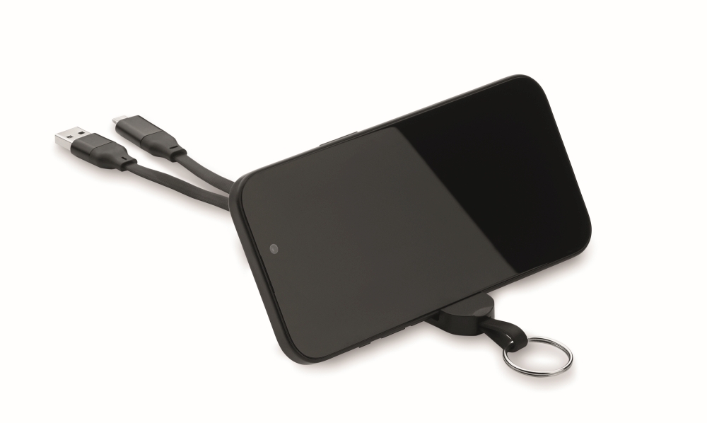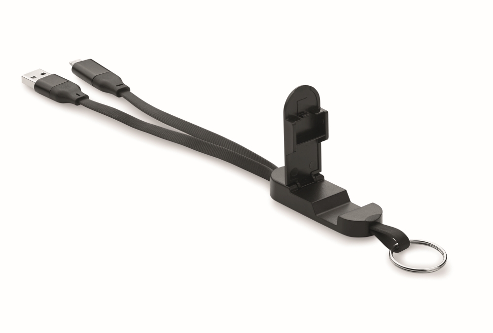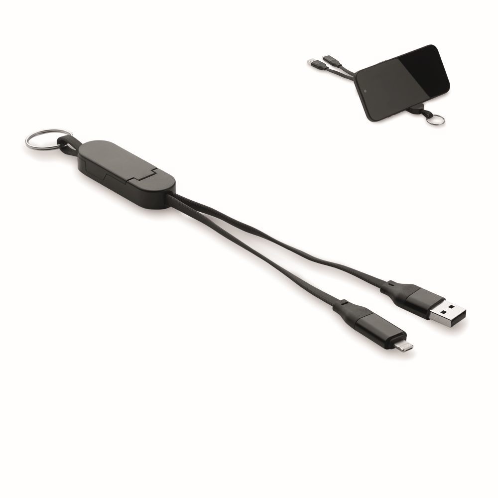Přívěsek na klíče a nabíjecí 60W kabel s funkcí stojánku na telefon. Kryt z recyklovaného ABS. Vstup: 2v1 Type-C a Type-A. Výstup: Type-C a micro-B (2v1 kolíku). Délka kabelu: 26 cm. Rozměry: 2,1 x 1,1 x 27,5 cm