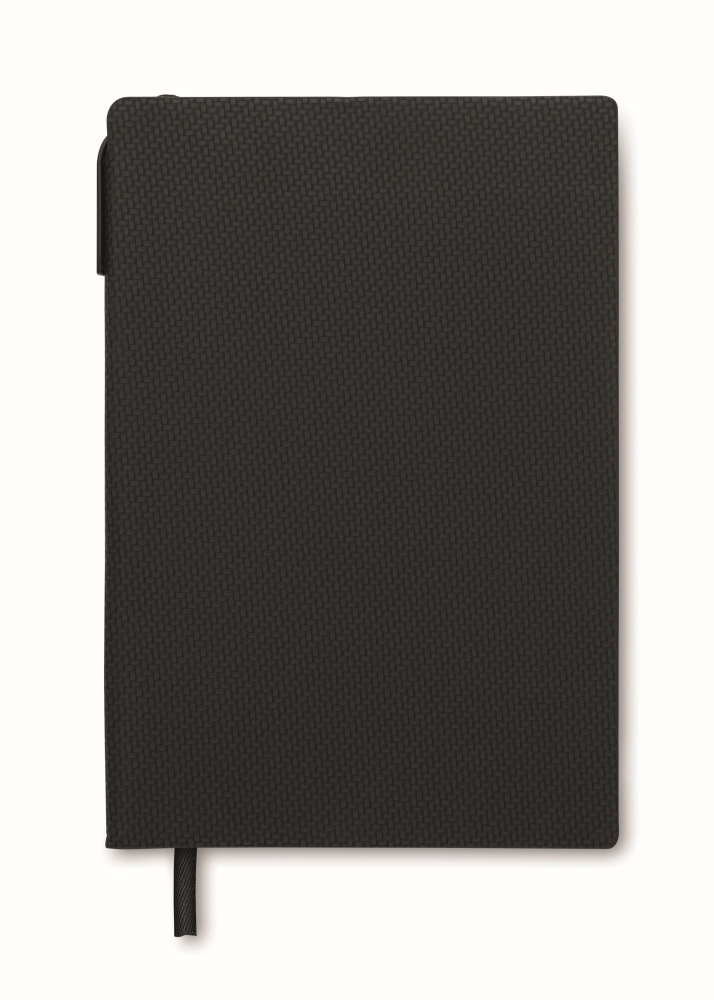 Zápisník formátu A5 v pevných PU deskách se strukturovaným povrchem. Obsahuje 160 recyklovaných linkovaných stran a plastové kuličkové pero s otočným mechanismem uložené uvnitř hřbetu. Rozměry: 14,5 × 1,1 × 21 cm.