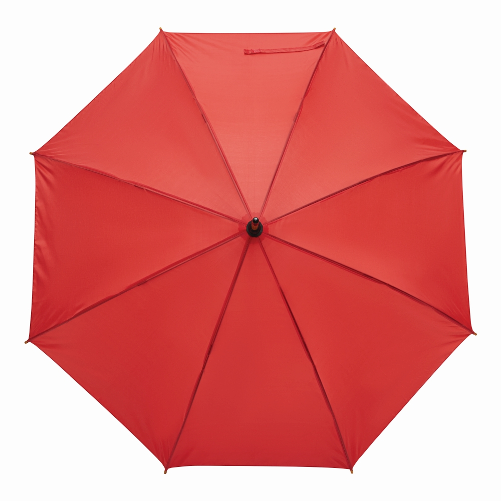 Automatický dřevěný deštník se sklolaminátovými žebry, dřevěnými hroty a dřevěnou zakřivenou rukojetí, polyesterový pongee potah vyrobený z recyklovaného plastu (RPET), uzavírací pásek na suchý zip. Rozměry: O103 cm / 89 cm