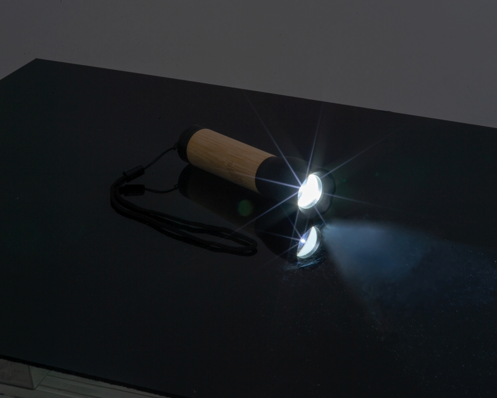Dobíjecí svítilna vyrobená z recyklovaného hliníku s bambusovou rukojetí, výkonem 400 lumenů a kapacitou baterie 300 mAh. Rozměry: o 3,3 x 11,5 cm