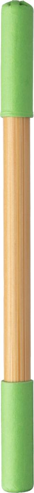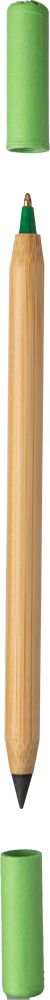 Bambusová nekonečná tužka a kuličkové pero. Jedna strana s nekonečnou tužkou a druhá s kuličkovým perem, obě s barevným kartonovým víkem. Modrý inkoust. Materiál: bambus Rozměry: 1 x 15,4 cm