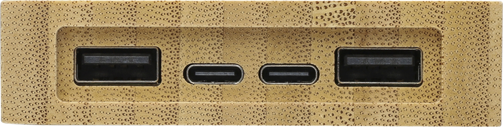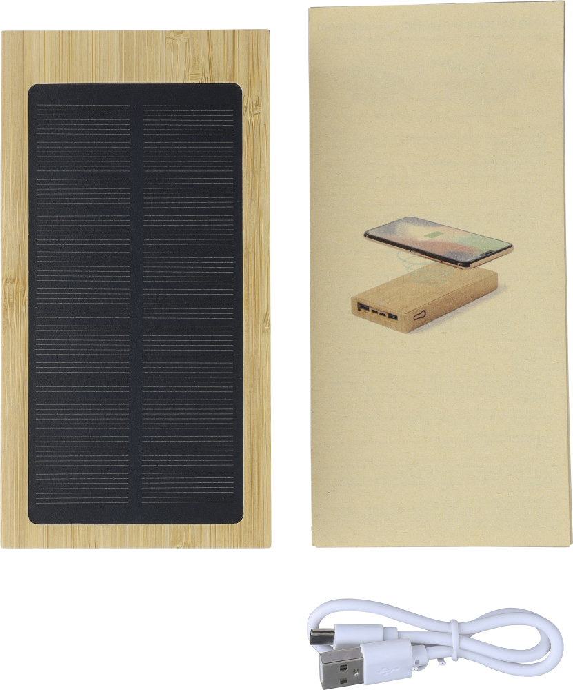 Bambusová solární powerbanka s kapacitou 10 000 mAh, dvěma USB-A výstupy a dvěma porty typu C pro vstup a výstup. Na zadní straně je bezdrátová nabíječka s laserově gravírovaným symbolem bezdrátového připojení a pěti kontrolkami. Na horní straně je solární panel (6,3 x 12,8 cm). Bezdrátový výstup: 5V DC/1A (5W), bezdrátová nabíjecí vzdálenost: 6 mm. Vstup/výstup přes kabel: DC 5V/2,4A. Vybaven ochranou proti zkratu, přebití a nadměrnému vybití. Součástí balení je bílý 30cm kabel. Jednotlivě baleno v hnědé kartonové krabici. Rozměry: 14,9 x 7,8 x 2 cm