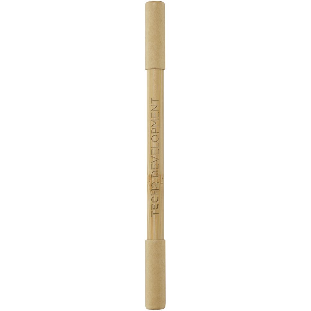 Bambusové duo pero má dvě hlavy: 1 kuličkové pero a 1 bezinkoustové pero. Bezinkoustová strana nevyžaduje inkoustové bombičky ani náplň. Grafitově černá špička pera je navržena tak, aby zanechávala viditelné stopy při kontaktu s povrchem pro psaní. Výběr pera vyrobeného z bambusu je udržitelnější rozhodnutí a podporuje používání obnovitelných materiálů. Kuličkové pero má černý inkoust, velikost hrotu 1,00 mm a délku psací stopy 600 metrů. Délka psací stopy bezinkoustového pera: 1500 metrů. Rozměry: 17,2 x O 0,9 cm.