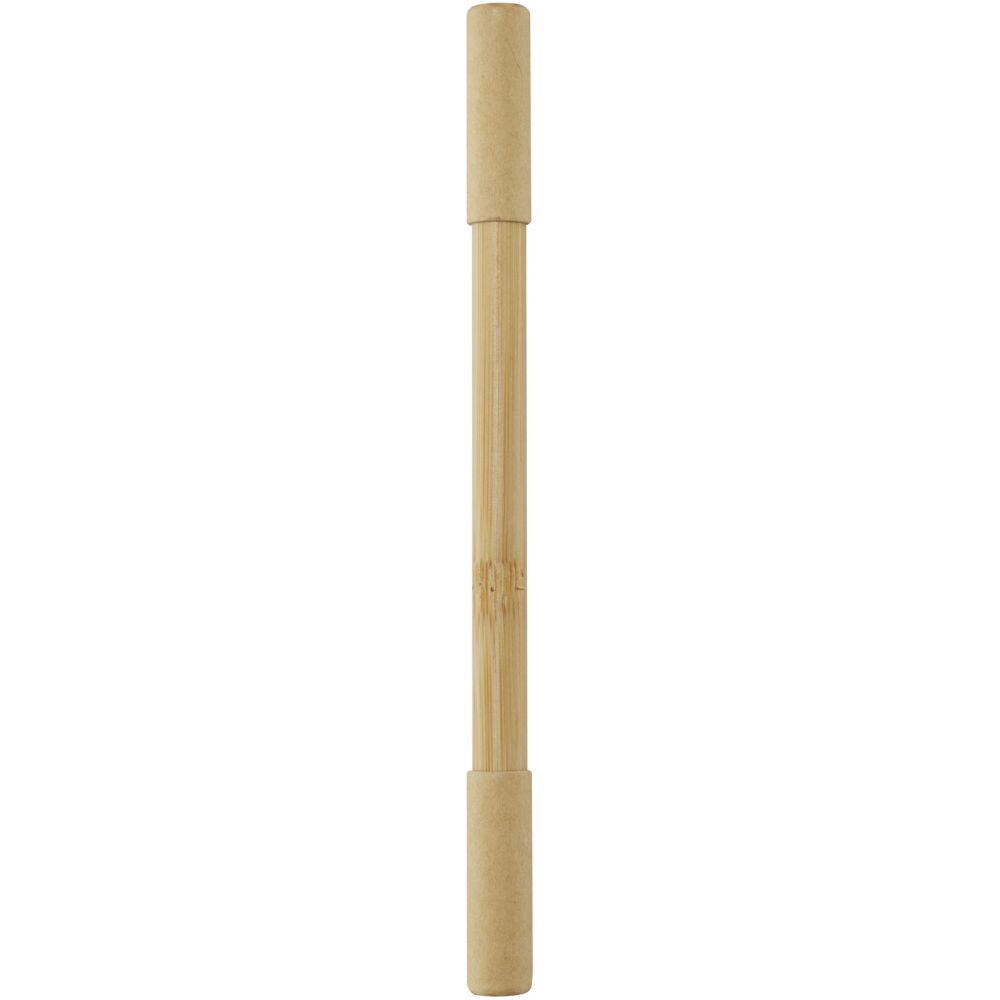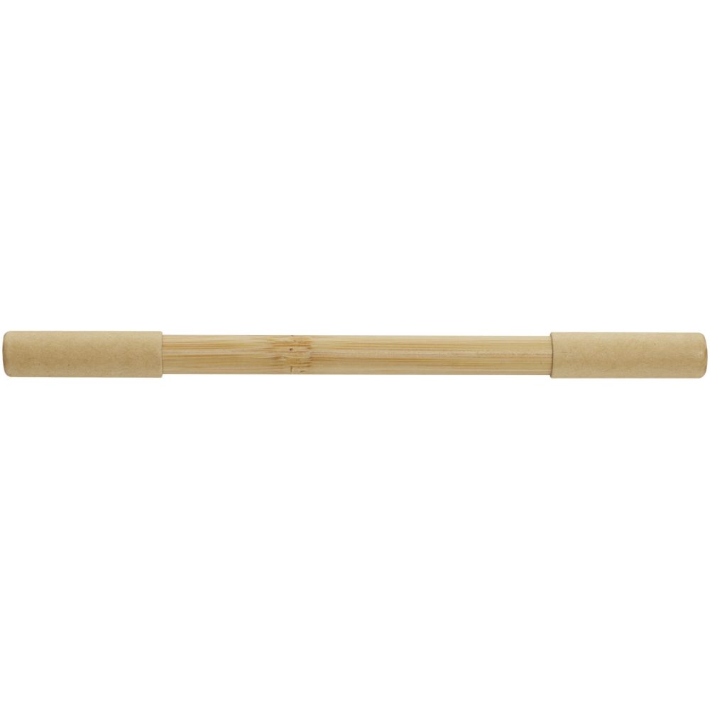 Bambusové duo pero má dvě hlavy: 1 kuličkové pero a 1 bezinkoustové pero. Bezinkoustová strana nevyžaduje inkoustové bombičky ani náplň. Grafitově černá špička pera je navržena tak, aby zanechávala viditelné stopy při kontaktu s povrchem pro psaní. Výběr pera vyrobeného z bambusu je udržitelnější rozhodnutí a podporuje používání obnovitelných materiálů. Kuličkové pero má modrý inkoust, velikost hrotu 1,00 mm a délku psací stopy 600 metrů. Délka psací stopy bezinkoustového pera: 1500 metrů. Rozměry: 17,2 x O 0,9 cm.