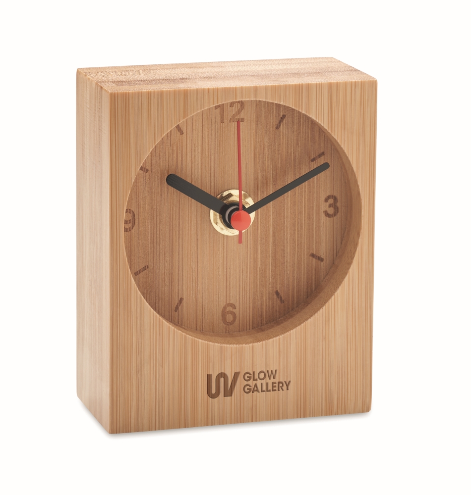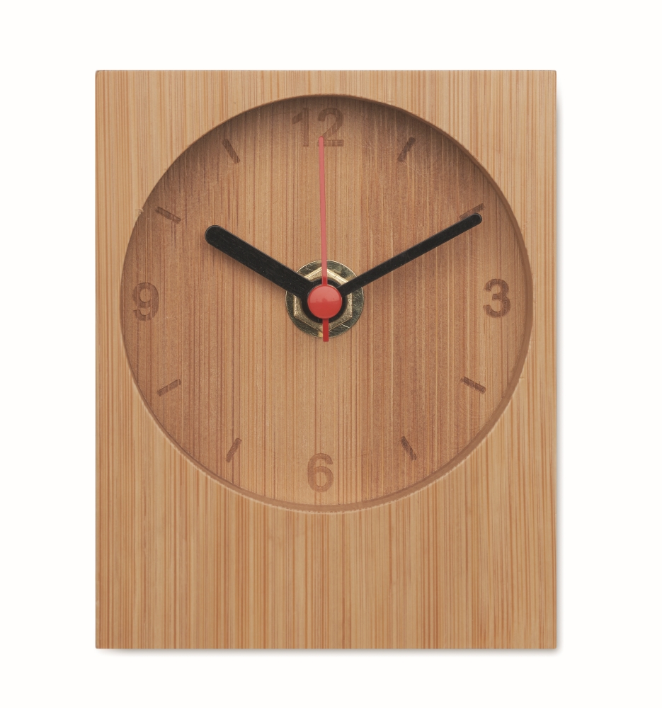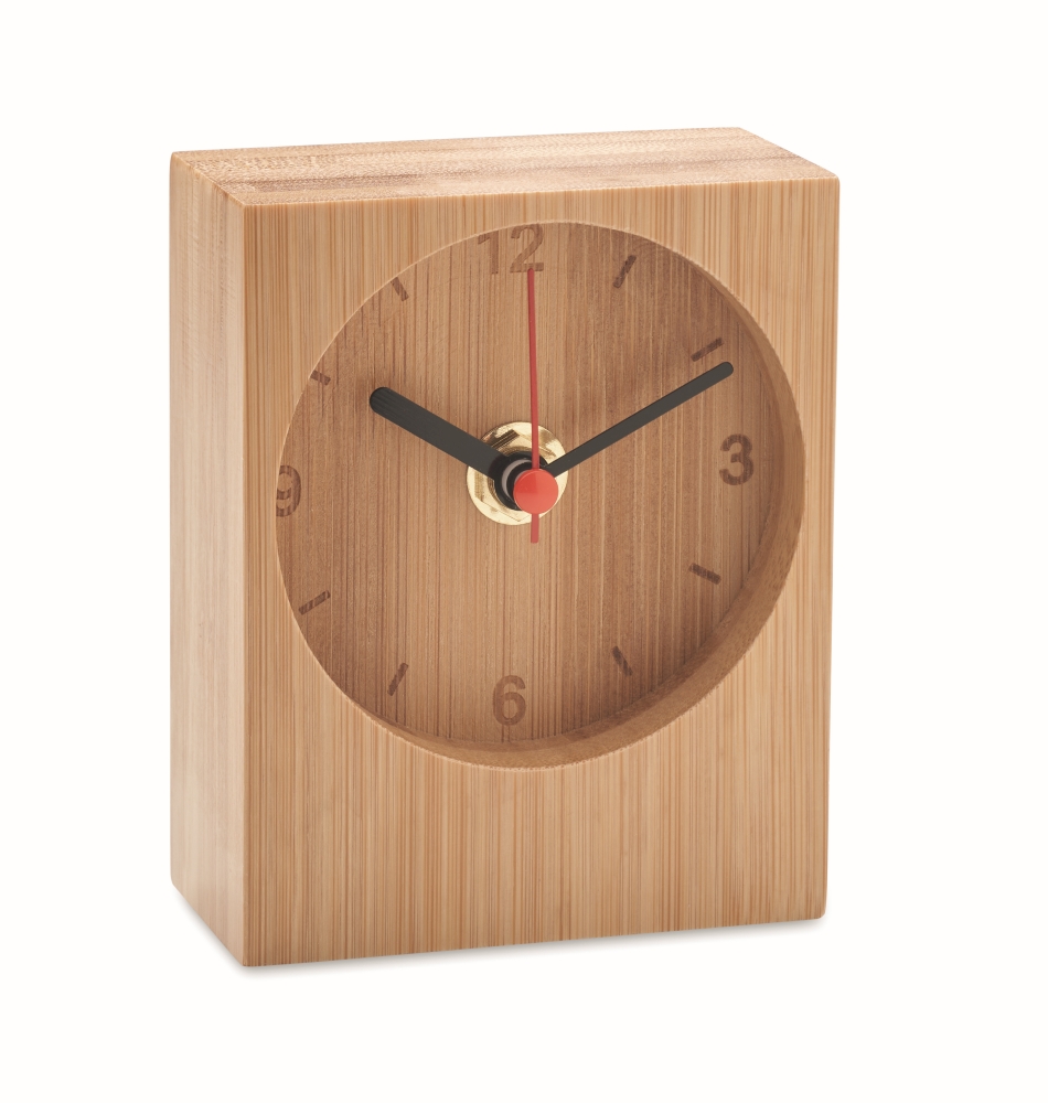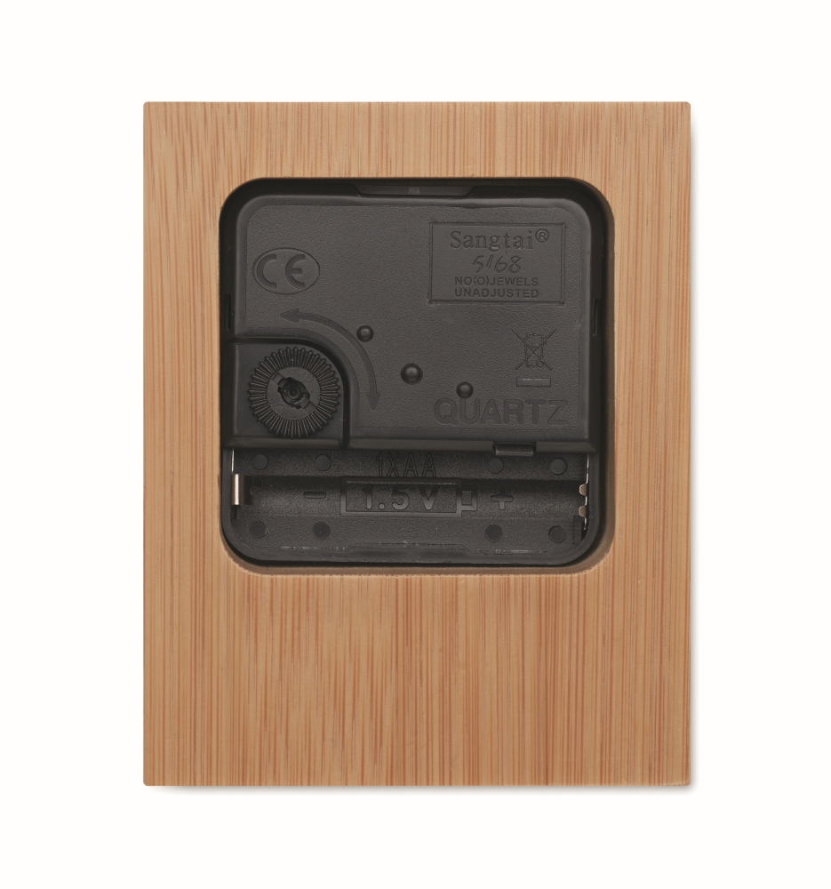 Analogové bambusové stolní hodiny. 1 baterie AA není součástí balení. Rozměry: 8 x 4 x 9,9 cm. Materiál: bambus