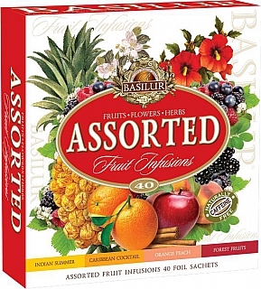 Směs ovocných čajů, aromatizovaná, porcovaná 40x1,8g Složení: FOREST FRUITS - šípek plod 35 %, ibišek květ 40 %, pomeranč plod 10 %, granátové jablko plod 5 %, přírodní aroma (jahoda, mučenka, kyselina citronová), ORANGE PEACH - ibišek květ 51 %, čekanka list 15 %, pomeranč plod 12 %, ostružiník list 12 %, přírodní aroma (pomeranč, broskev), INDIAN SUMMER - ibišek květ 35 %, šípek plod 28 %, čekanka list 16 %, skořice 10 %, růže květ 2 %, přírodní aroma (pomeranč, růže, kyselina citronová), CARIBBEAN COCKTAIL - ibišek květ 35 %, šípek plod 19 %, pomeranč plod 18 %, čekanka list 15 %, anýz 8 %, růže květ 2 %, přírodní aroma (ananas, kokos, tropico) Hmotnost: 72g (40x1,8g)
