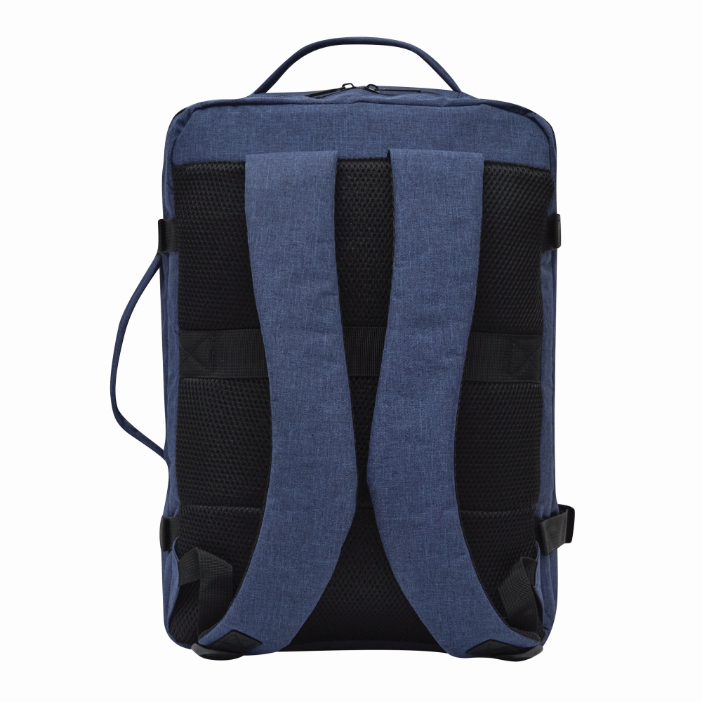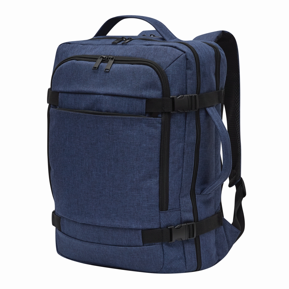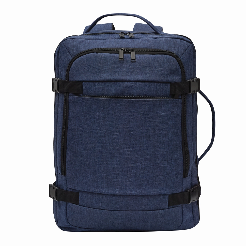 2 přední přihrádky na zip, jedna s organizérem (3 zasouvací kapsy, 2 poutka na pera), 1 velká polstrovaná hlavní přihrádka s popruhem a zipem, 1 polstrovaná přihrádka na notebook se zipem, 1 vyztužené horní a boční madlo, polstrované ergonomické ramenní popruhy a polstrovaný zádový panel s pouzdrem na teleskopickou rukojeť kufru, 2 kompresní popruhy se zapínáním na patentky na každé straně. Rozměry: cca 32 x 20 x 45 cm