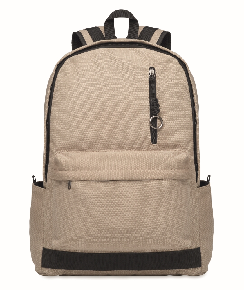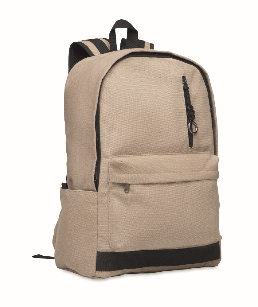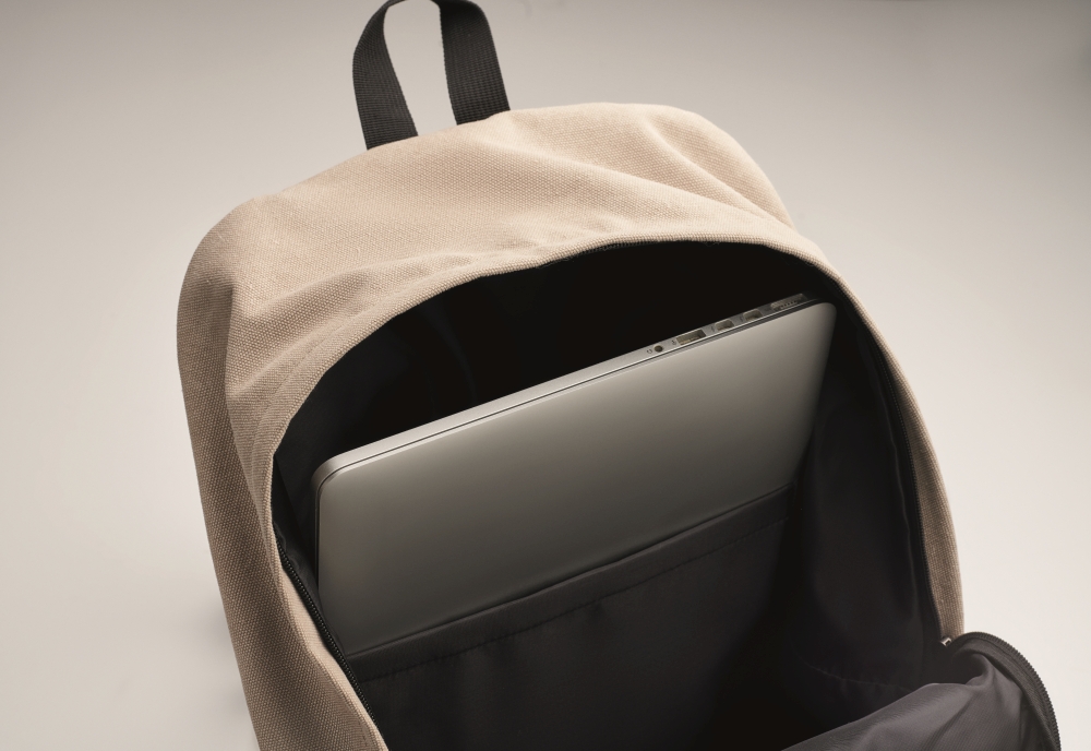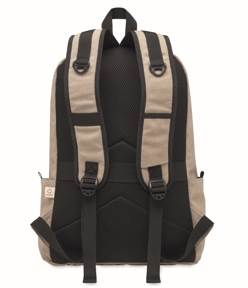 Batoh na 15palcový notebook z recyklované předspotřební bavlny. Velká přední kapsa na zip s vnitřní přihrádkou na notebook. Malá přední kapsa na zip. Dvě boční kapsy. Polstrovaná záda a ramenní popruhy, zadní panel a spodní část. 450 gr/m2. Rozměry: 30 x 18 x 45 cm. Materiál: recyklovaná bavlna