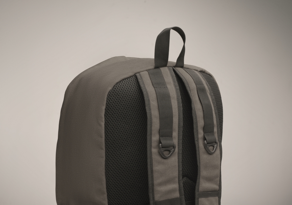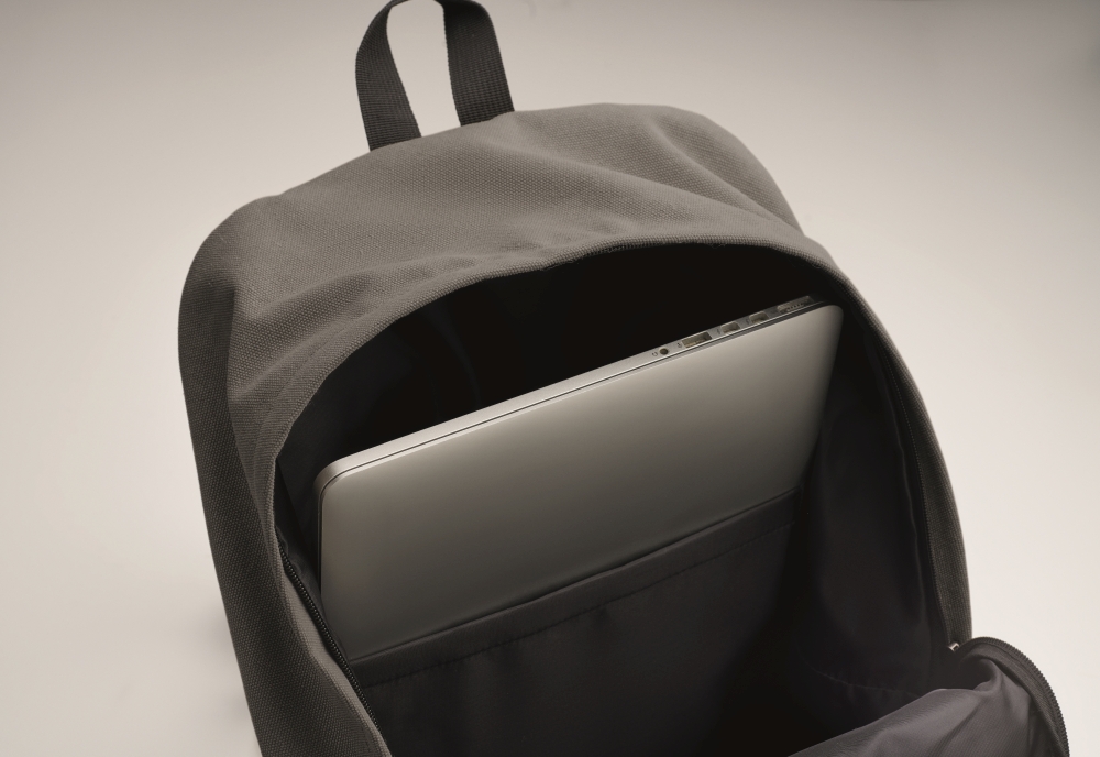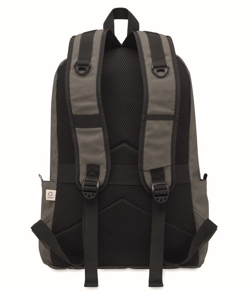 Batoh na 15palcový notebook z recyklované předspotřební bavlny. Velká přední kapsa na zip s vnitřní přihrádkou na notebook. Malá přední kapsa na zip. Dvě boční kapsy. Polstrovaná záda a ramenní popruhy, zadní panel a spodní část. 450 gr/m2. Rozměry: 30 x 18 x 45 cm. Materiál: recyklovaná bavlna