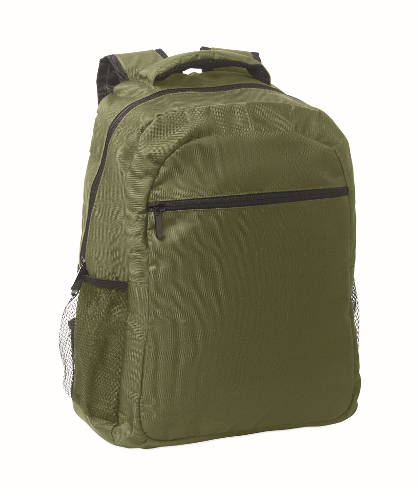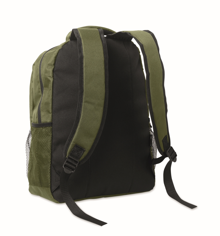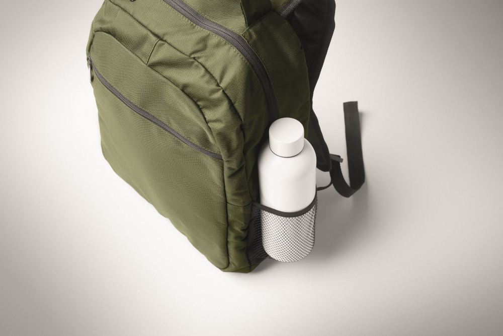 Batoh z polyesteru 600D RPET s polstrovanou přihrádkou na 15palcový notebook uvnitř, síťovanými kapsami na obou stranách a přední kapsou na zip. Rozměry: 32 x 15 x 42 cm