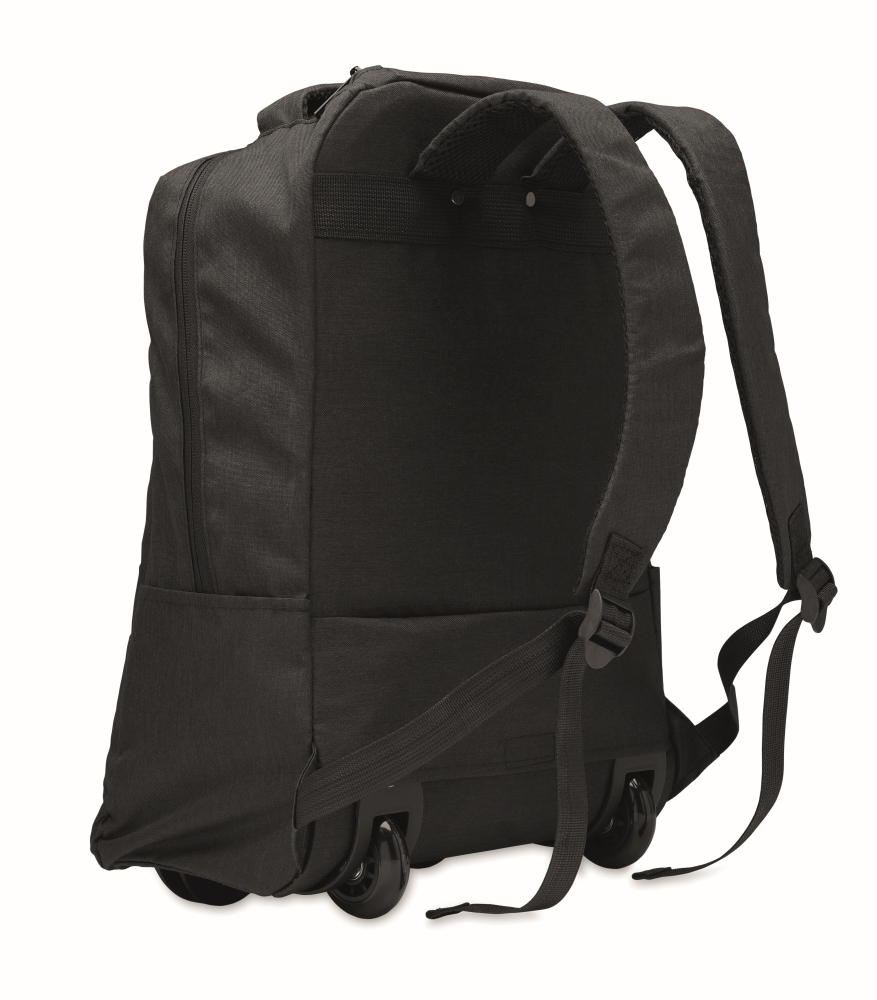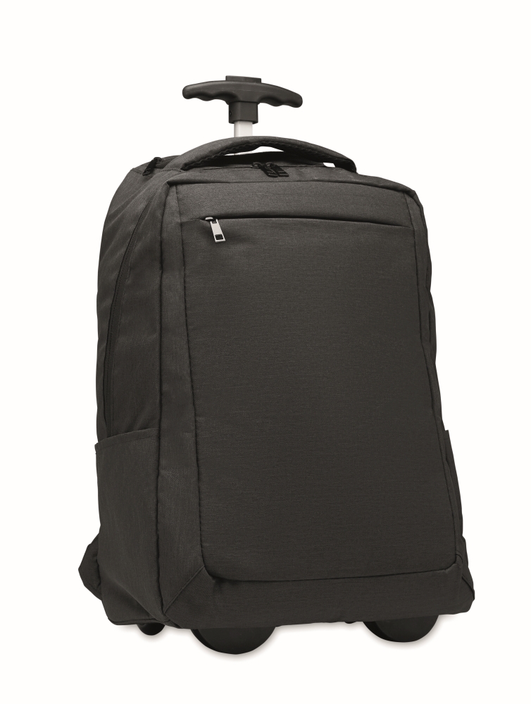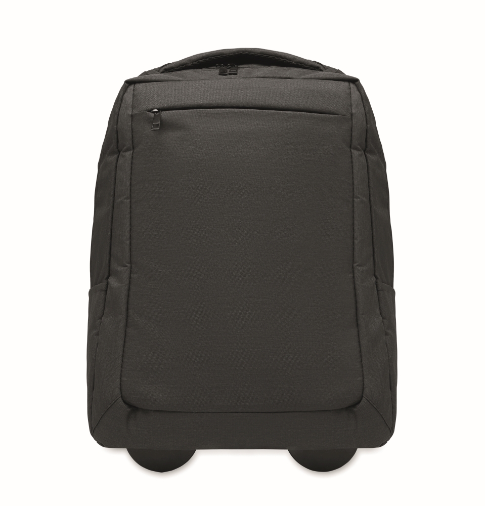 Batoh na kolečkách pro notebook. Vyrobeno z polyesteru 600D RPET. Má jednu vnitřní přihrádku na 15palcový notebook, přední kapsu na zip, dvě boční kapsy na drobnosti a tři vnitřní zasouvací kapsy. Polstrovaná záda a ramenní popruhy. Dvě kolečka a dvojitý trubkový rám. Rozměry: 31 x 19 x 47 cm. Materiál: RPET