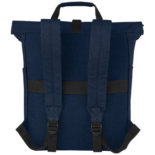 Batoh inspirovaný maloobchodem je vyroben z vysoce odolných a udržitelných materiálů, recyklovaného plátna GRS a podšívky GRS RPET. Může se pochlubit speciálním pouzdrem na tablet spolu s polstrovanou přihrádkou na 15" notebook. Batoh má také 2 boční kapsy na vodu a jednu velkou přední kapsu na zip a také rolovací otvor na zip pro maximální skladování a bezpečnost. Díky 2 vyztuženým popruhovým držadlům se snadno a pohodlně přenáší jako firemní taška. Díky dekorativní kovové desce vynikne logo s jemným a matným povrchem.