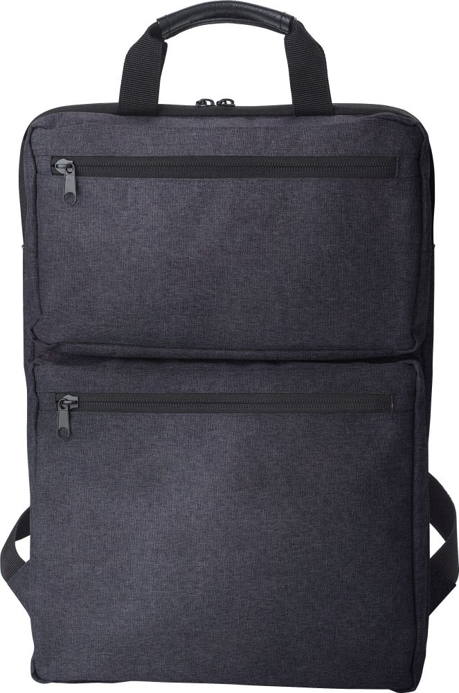 Batoh z Polycanvasu 300D se 2 předními kapsami na zip, s vnitřní kapsou na notebook 15". Batoh má polstrované ramenní popruhy a dvě krátká ucha na horní části k přenášení. Rozměry: 27 x 6 x 39.5 cm