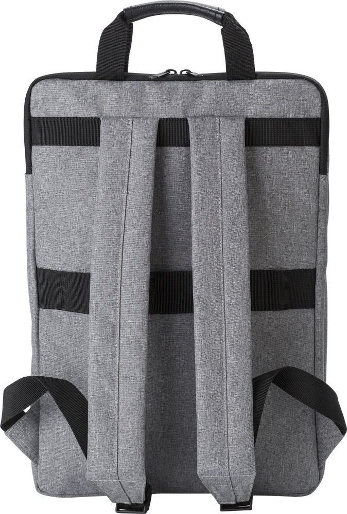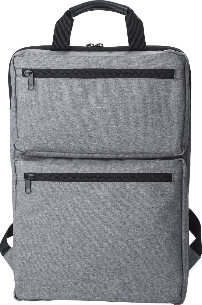 Batoh z Polycanvasu 300D se 2 předními kapsami na zip, s vnitřní kapsou na notebook 15". Batoh má polstrované ramenní popruhy a dvě krátká ucha na horní části k přenášení. Rozměry: 27 x 6 x 39.5 cm