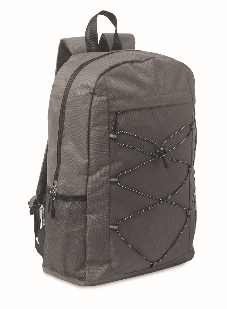 Batoh z polyesteru 600D RPET s ozdobnou šňůrkou a přední kapsou na zip. Síťované kapsy na obou stranách. Rozměry: 30 x 14 x 45 cm