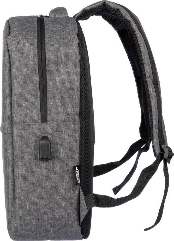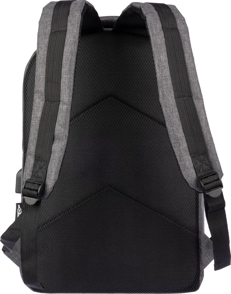 Batoh rPET s otvorem pro USB port (a USB kabelem uvnitř) s velkou přihrádkou na zip na horní straně a kapsou na zip na přední straně. Uvnitř je přihrádka pro 10palcová zařízení a jedna pro 15palcová zařízení. S nastavitelnými rukojeťmi. Materiál: RPET Rozměry: 29 x 13 x 43 cm