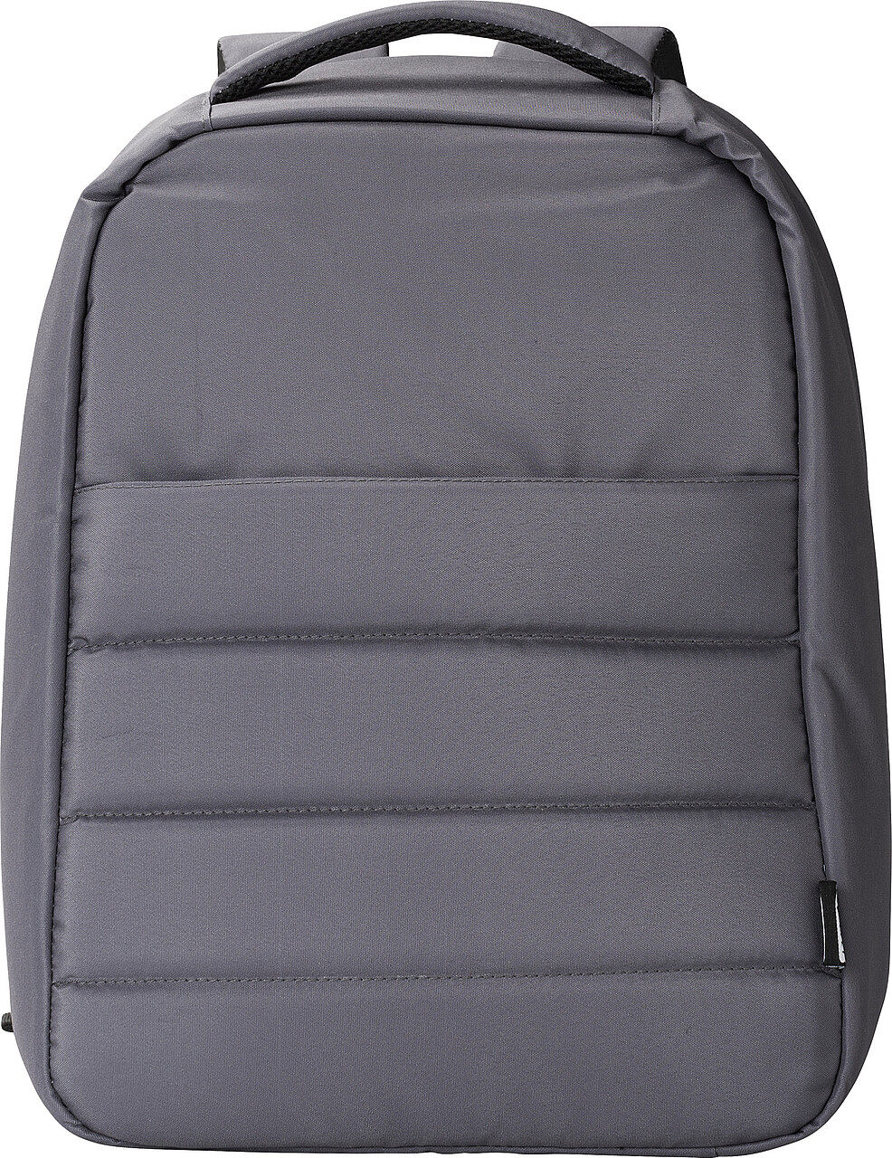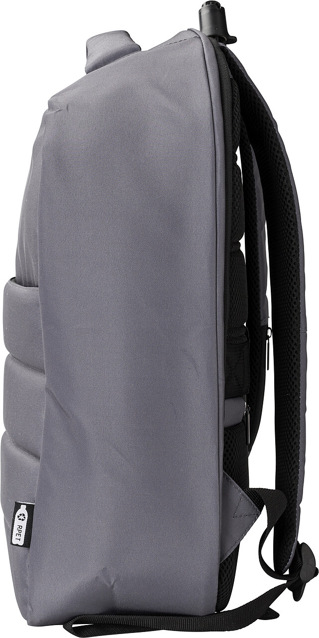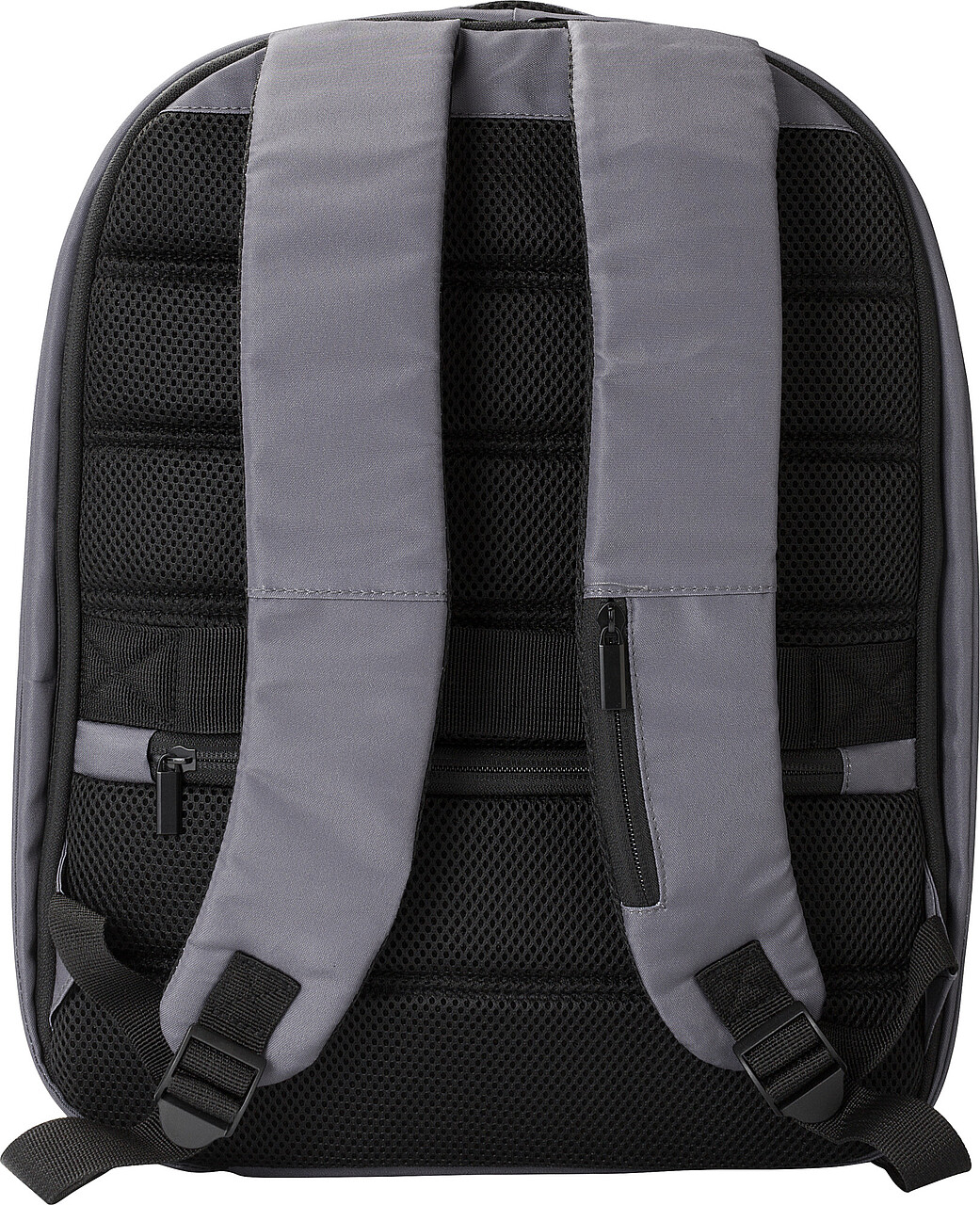 Batoh na notebook (15") z polyesteru RPET (300D), s ochranou zipu proti krádeži. Polstrovaná záda. Uvnitř dvě přihrádky. Na zadní straně kapsa a popruh k upevnění na teleskopické madlo kufru. Rozměry: 32 x 13 x 42 cm