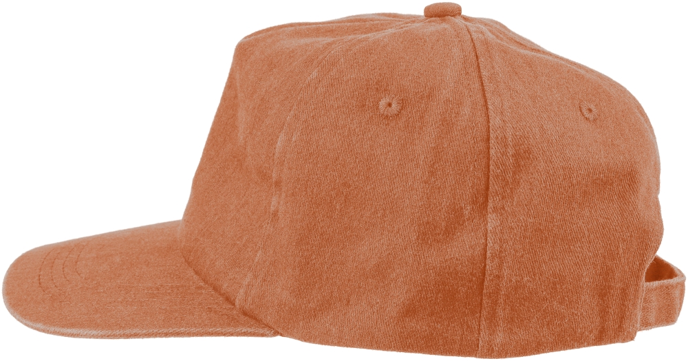 Bavlněná kšiltovka (240 g/m2) se sepranou povrchovou úpravou, s 5panelovým designem a 7 cm kšiltem. Nastavitelný střih se zapínáním na mosaznou přezku. Uvnitř není podšívka.
