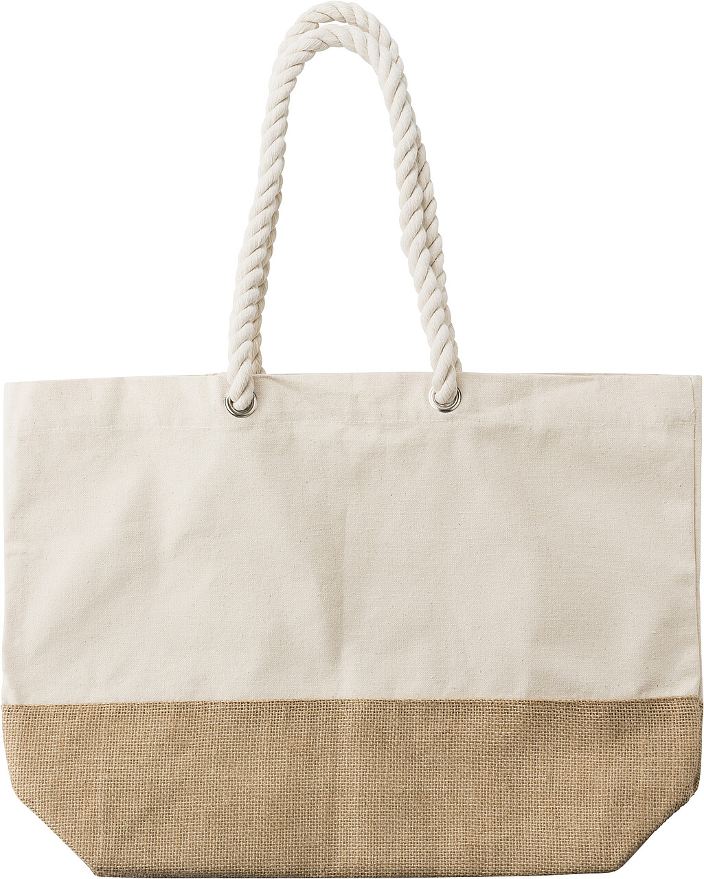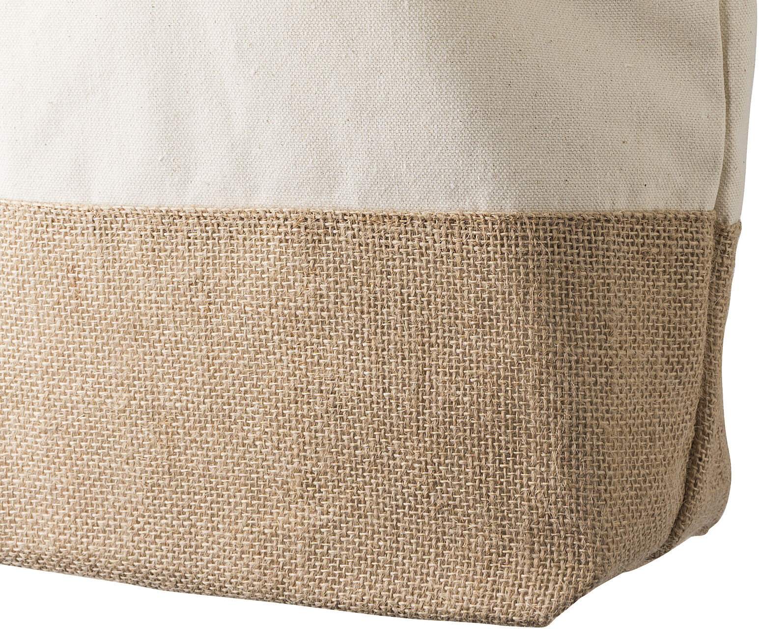 Bavlněná (280 g/m2) nákupní taška s jutovým dnem a masivními kroucenými držadly. Rozměry: 48 × 35 × 15 cm.