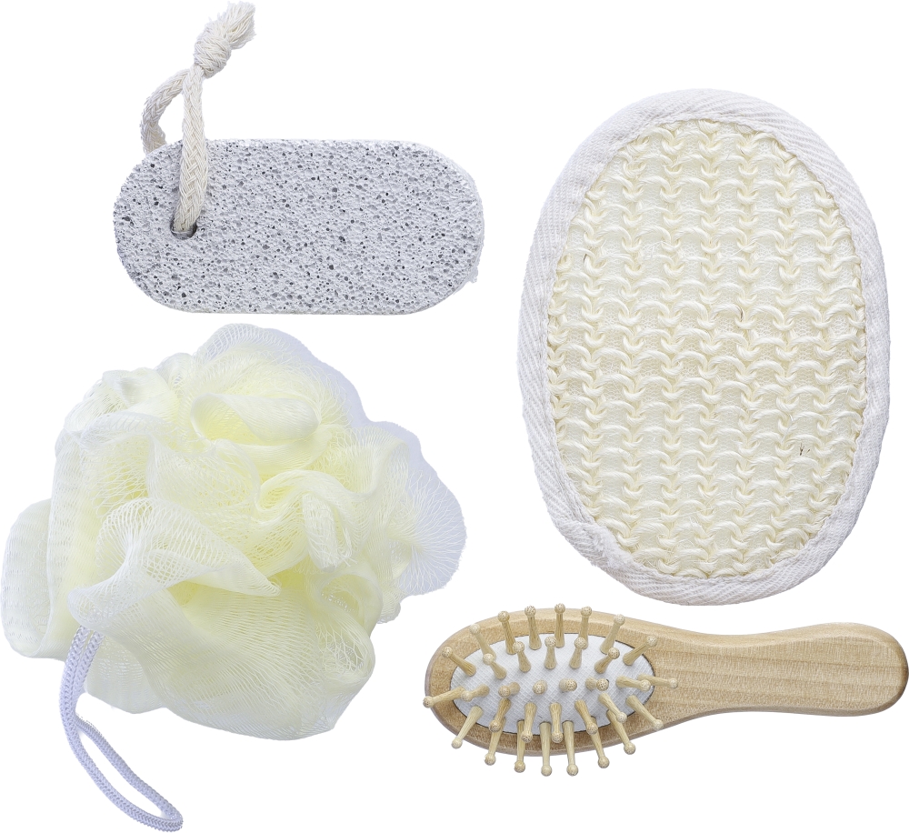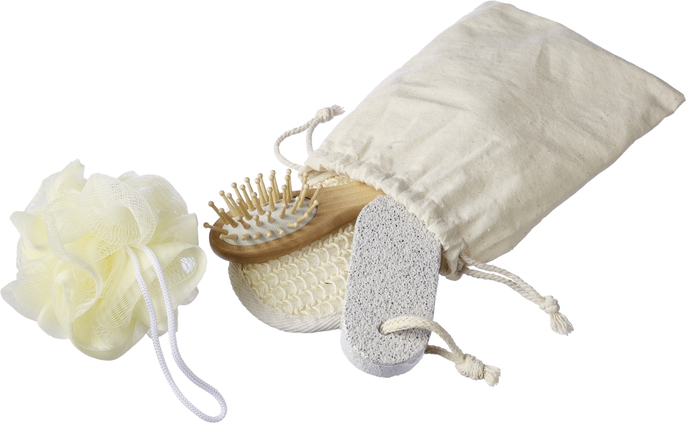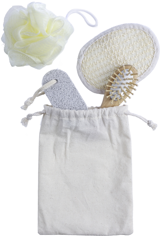 Bavlněná koupací souprava se 4 kusy: bambusový kartáč, měkká houba, drhnoucí houba a pemza (v sáčku). Jednotlivě baleno v bavlněném sáčku.Rozměry: 6,5 x 15 x 18 cm