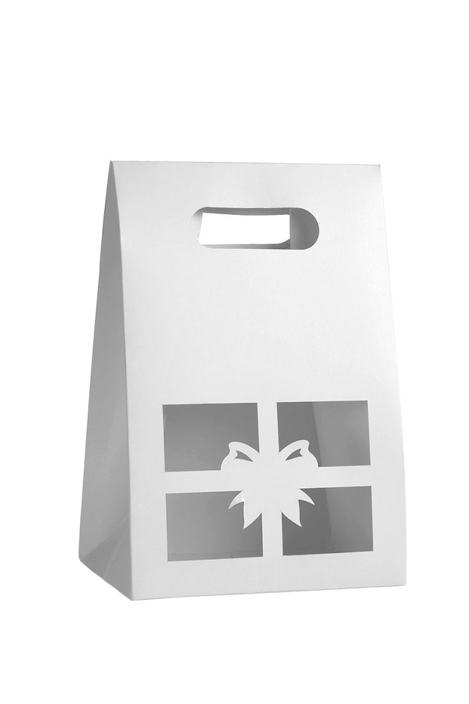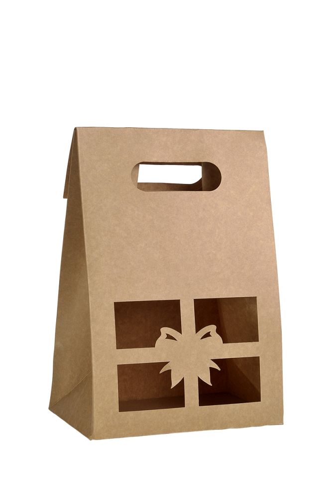 Dárková kartonová taška s výřezem. Taška má skládané dno, které je vyztužené třívrstvou lepenkovou vložkou. Přední strana má výřez okýnka s mašlí bez fólie. Materiál hnědý kraft. Na vyžádání lze vyrobit od 50 kusů také z bílé lesklé křídy nebo s celoplošným potiskem, s termínem dodání 3 týdny. Doporučená technologie tisku: sítotisk. Maximální velikost tisku: 22 × 10 cm. Rozměry: 30 × 24 × 12 cm.