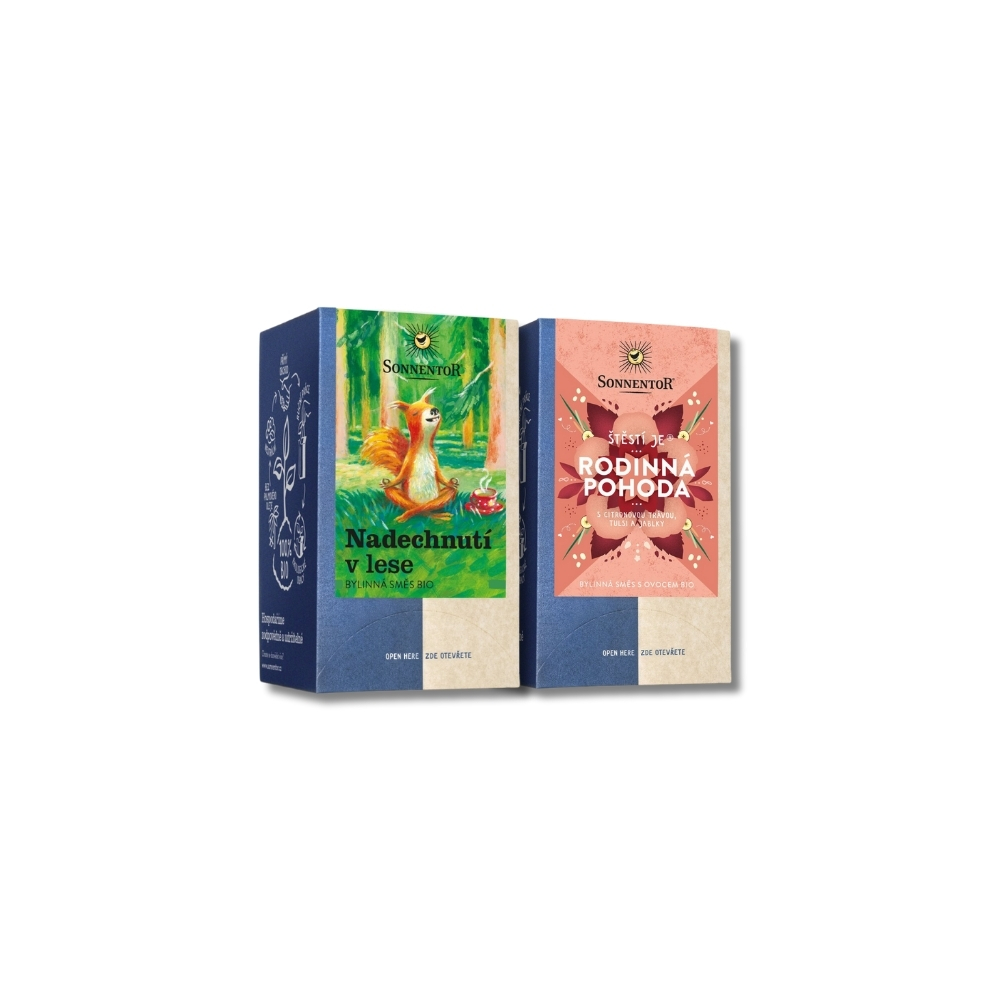 Dárková sada obsahuje balení dvou čajů značky Sonnentor. Štěstí je rodinná pohoda: bylinná směs s ovocem Bio citrónová, květinová, nasládlá. Nadechnutí v lese: bylinná směs bio – bylinná, pryskyřičná, nasládlá. Rozměr: 8,5 x 14,3 x 12,5 cm. Minimální odběr: 10 kusů. Doporučená technologie tisku: komplimentka