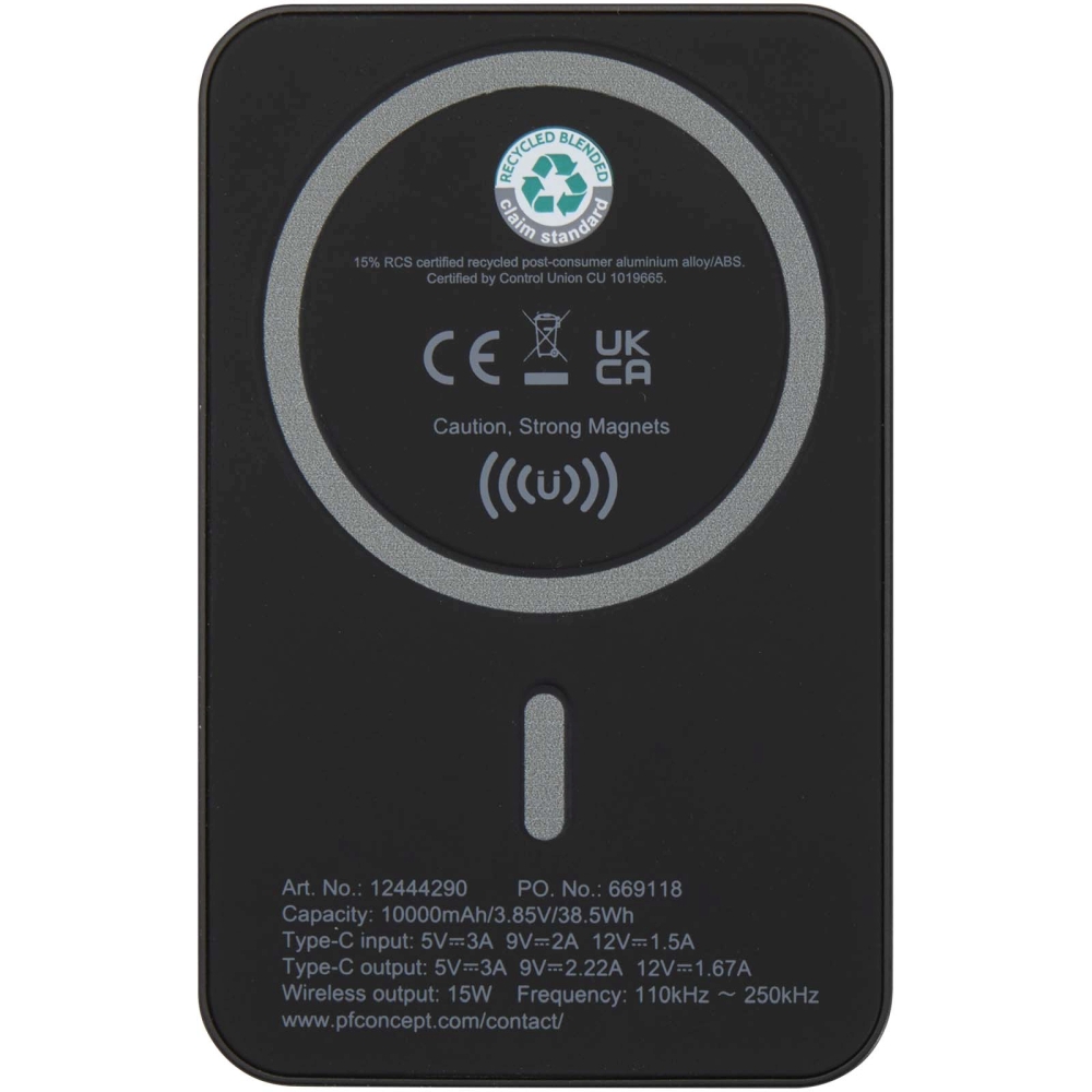 Bezdrátová 15W magnetická powerbanka, 10 000 mAh s 20W PD – vyrobeno z recyklovaného plastu, černá