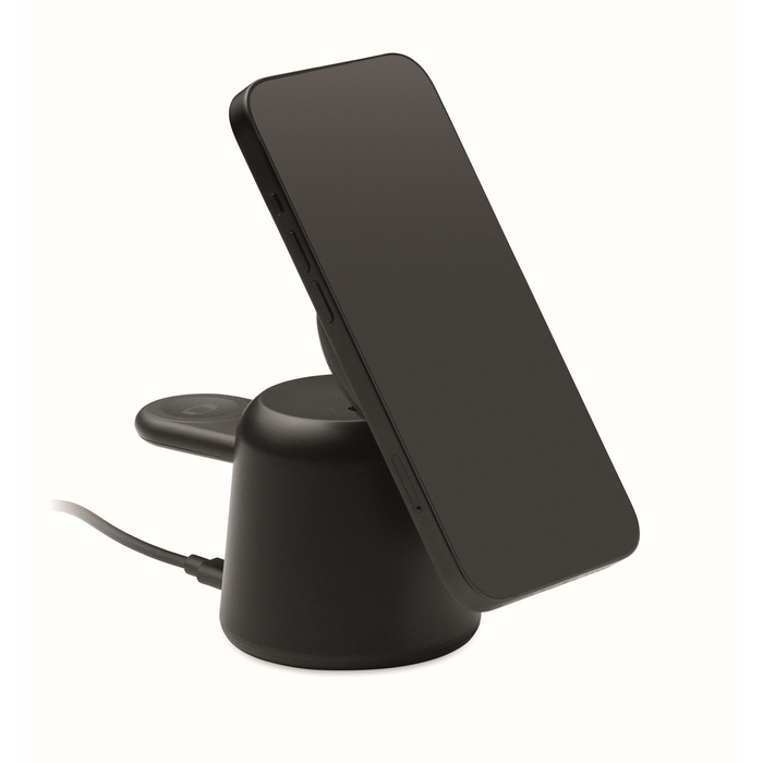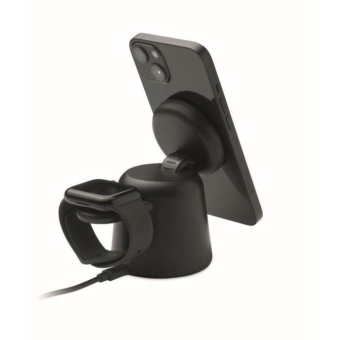 Nabíjecí stanice 3v1 z ABS plastu. Součástí je 15W magnetická bezdrátová nabíječka pro telefon a TWS s funkcí držáku a nabíječka pro chytré hodinky (pouze pro iOS). Magnetická funkce kompatibilní s iPhone® 12 a novějšími. Včetně přídavného magnetického kovového kroužku.Rozměry: 10,2 x 7,1 x 12cm