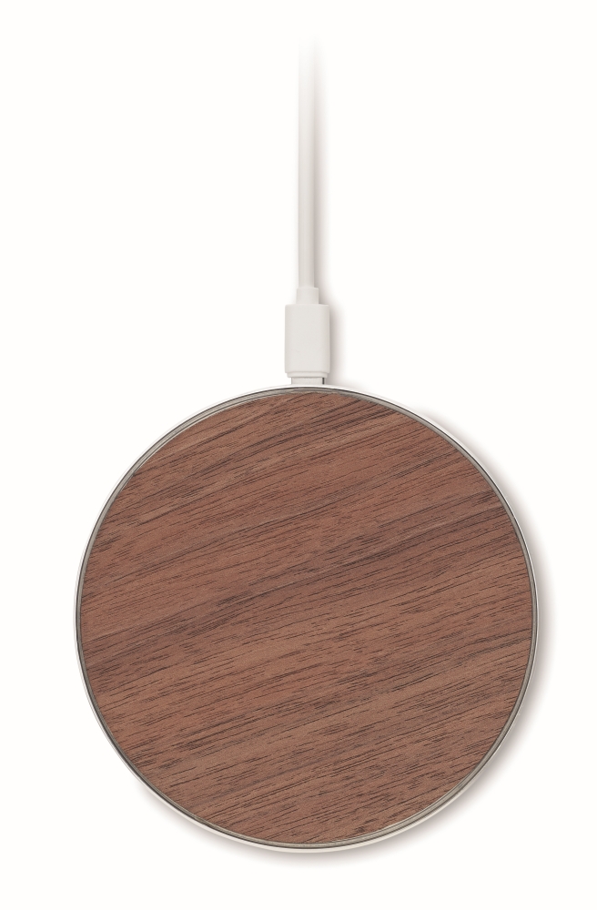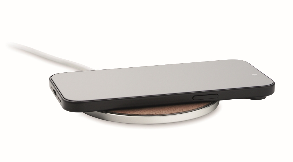 Bezdrátová nabíječka z recyklovaného hliníku. Horní část z ořechového dřeva. Výstup: 9V/1,67 A (15W). Kompatibilní se všemi zařízeními s podporou QI, jako jsou nejnovější Androidy, iPhone® 8, X a novější. Rozměry: O 10 x 0,7 cm