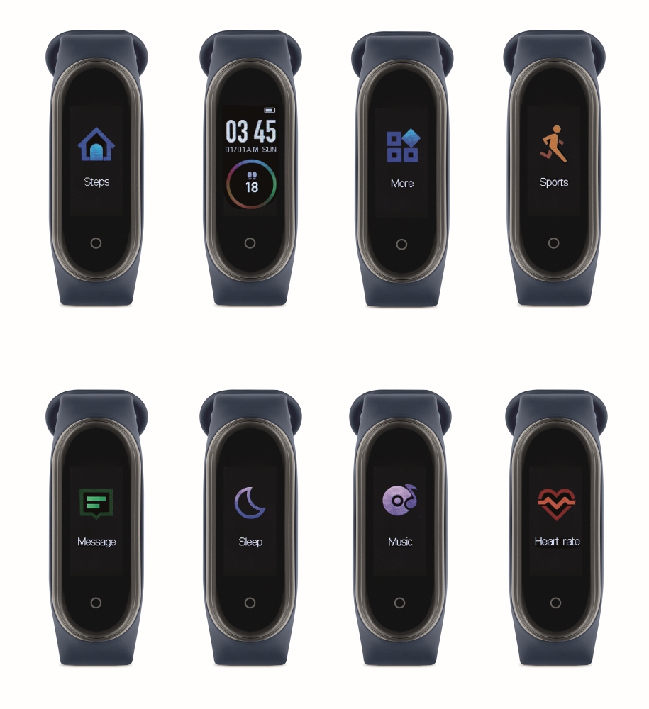 Bezdrátové 4.0 chytré zdravotní hodinky z ABS se silikonovým řemínkem. 0,96"" dotykový LCD displej. Dobíjecí baterie Li-Pol 90 mAh. Vyžaduje bezplatnou aplikaci (HryFine dostupná ve verzích pro iOS i Android)." Rozměry: 2,4 x 4,5 x 8 cm. Materiál: silikon