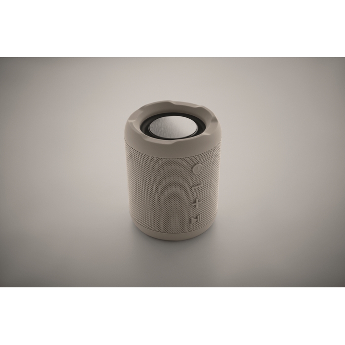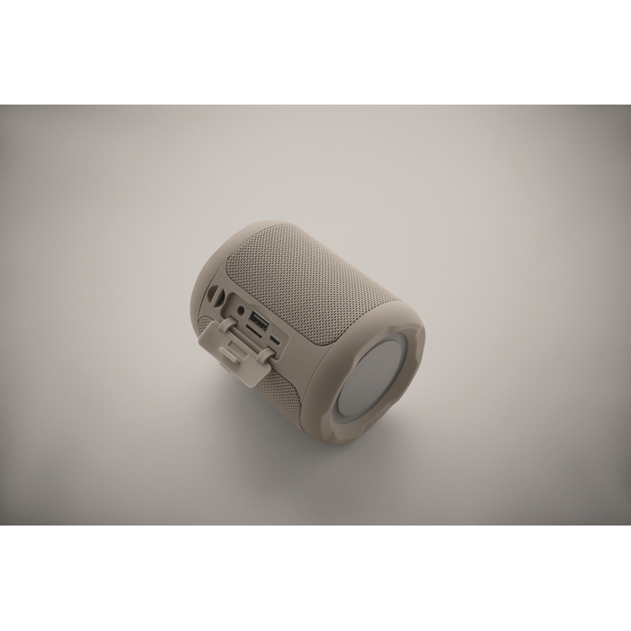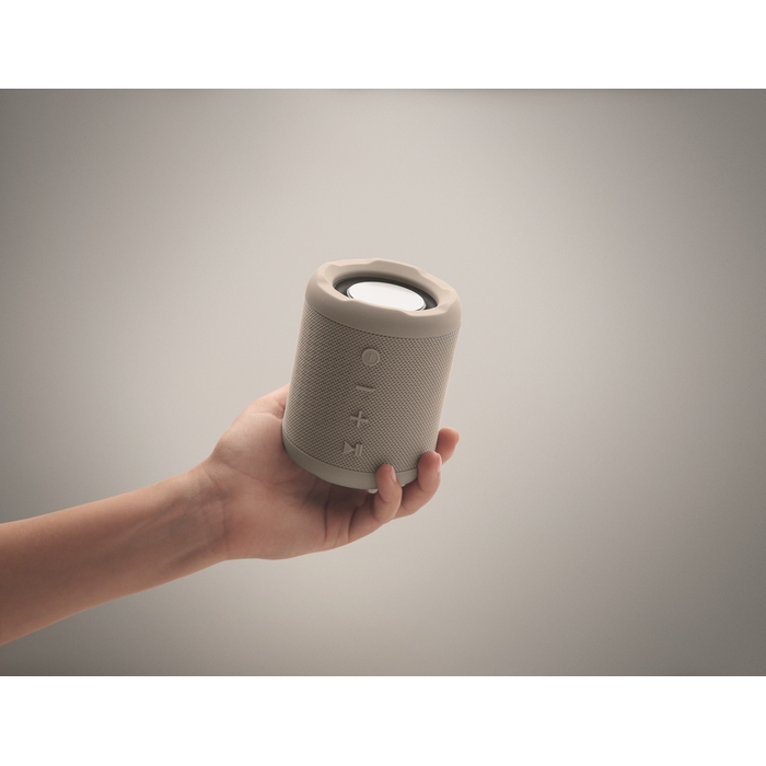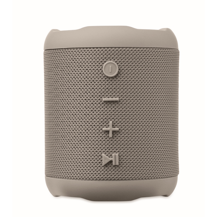 Bezdrátový 5.0 reproduktor z ABS s RPET tkaninou. Obsahuje dobíjecí baterii Li-ION 800 mAh. Port pro SD kartu a kabel AUX/USB. Výstupní data: 5W, 3Ohm a 5V. Doba přehrávání cca 3h.Rozměry: 11 x 8,5 x 8,5cm