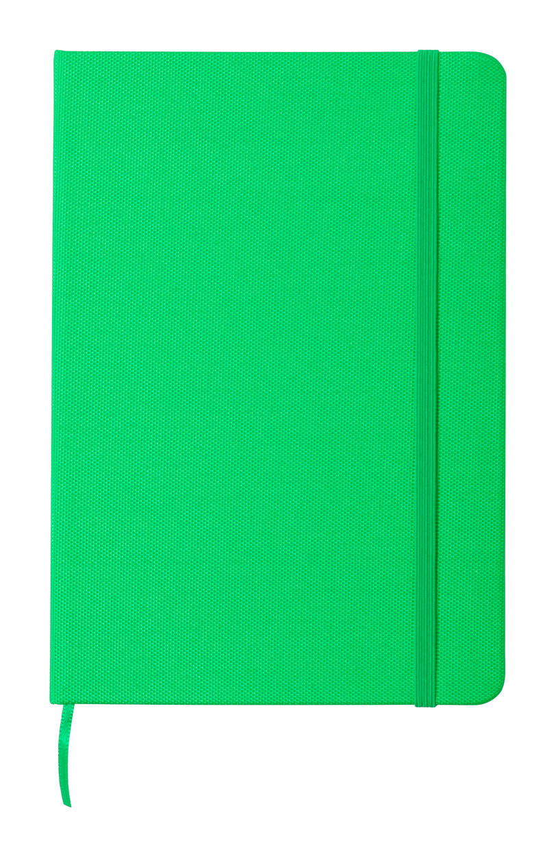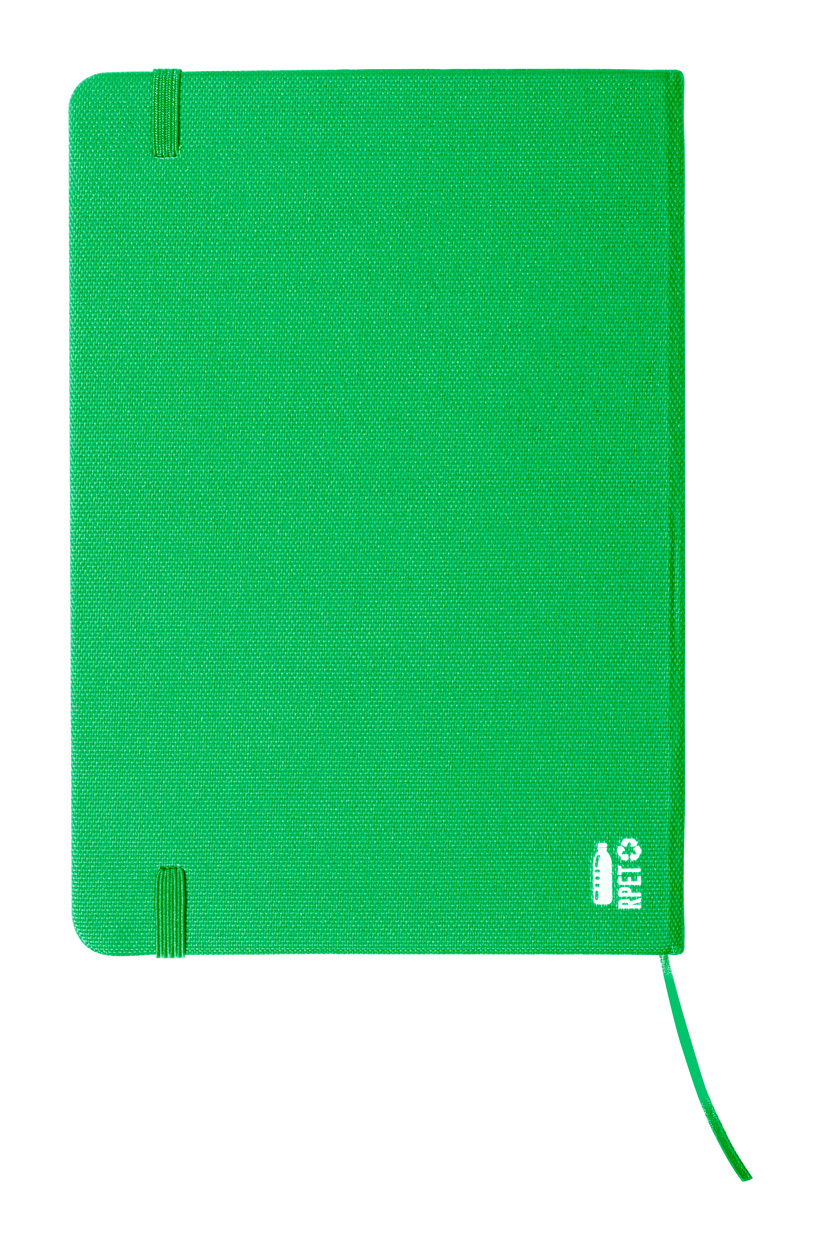 RPET blok A5 potažený polyesterem s 80 linkovanými listy, záložkou a gumičkou. Rozměr: 147×210×15 mm