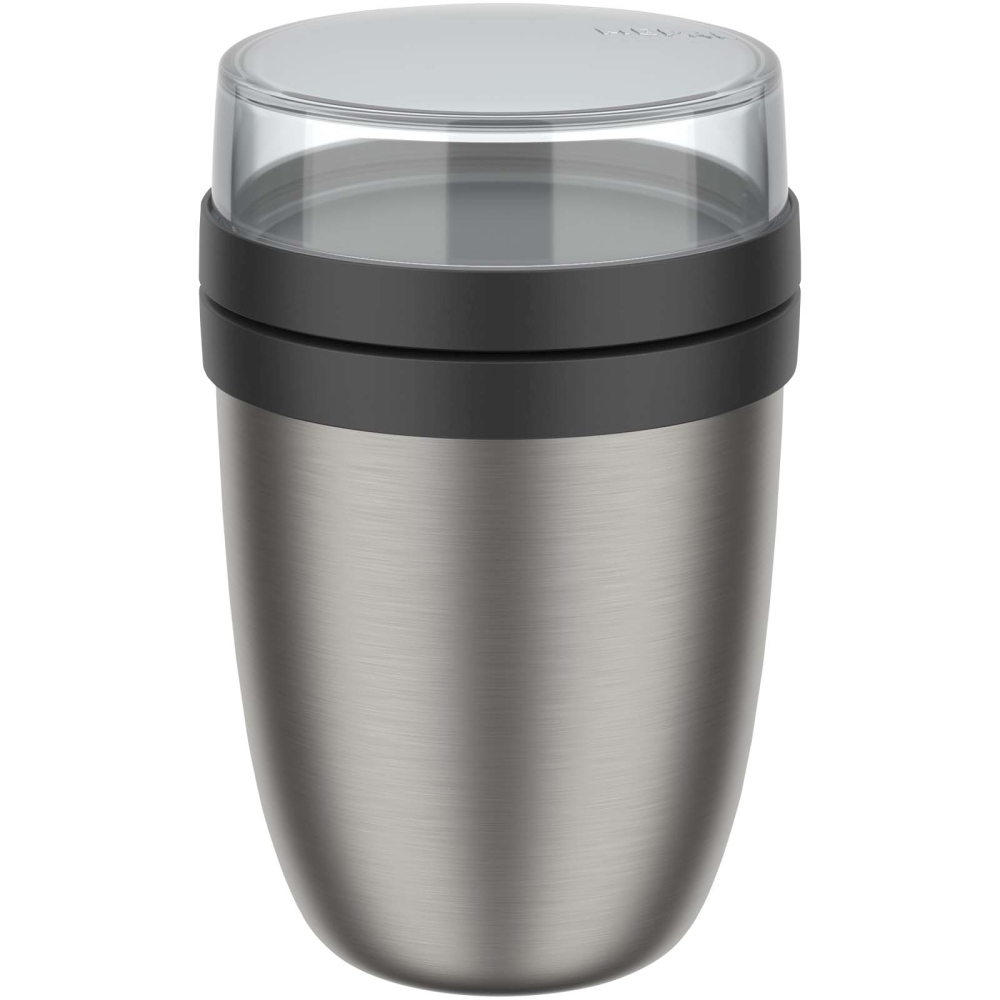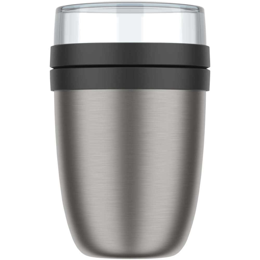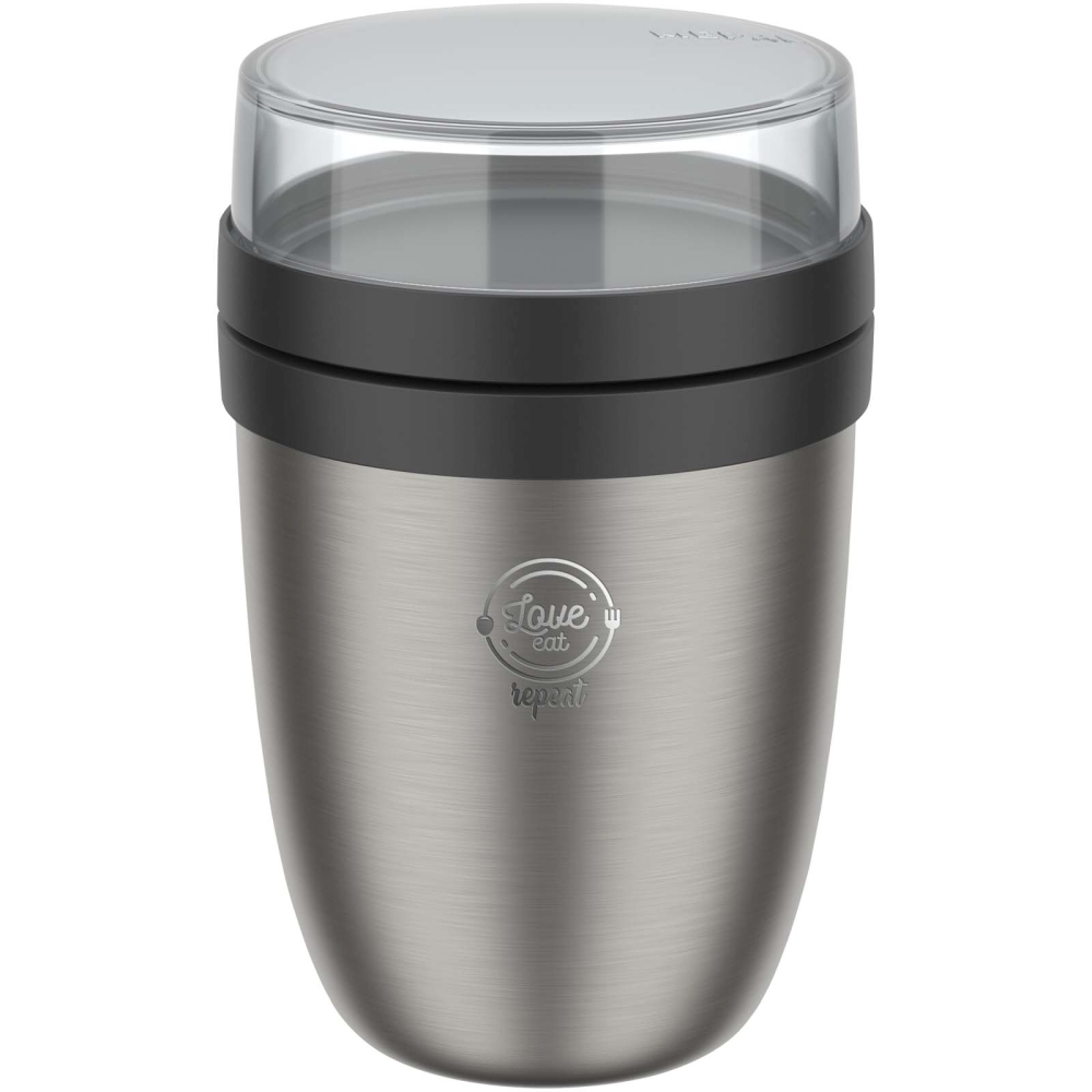 Tepelně izolovaný box na jídlo obsahující dvě různé přihrádky, díky kterým můžete uložit různé ingredience odděleně. Obě nádoby mají samostatné víko, aby se ingredience nesmíchaly. Udrží jídlo teplé 6–8 hodin a studené 12 hodin. Objem horní průhledné nádoby je 200 ml. Objem spodní nádoby je 500 ml. Vyrobeno z odolného materiálu. Vnější strana boxu zůstává chladná a suchá. Doporučujeme mýt ručně. Plastové části víka lze mýt v myčce na nádobí. Rozměry: 10,7 x 15,1 x 10,7 cm