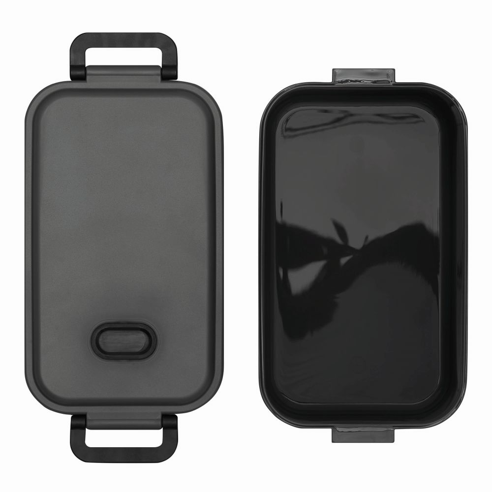 Plastová krabička na oběd s těsněním proti vytečení, větracím otvorem a uzavíráním na zaklapávací spony, objem cca 900 ml. Rozměry: 21 × 11,5 × 6 cm.