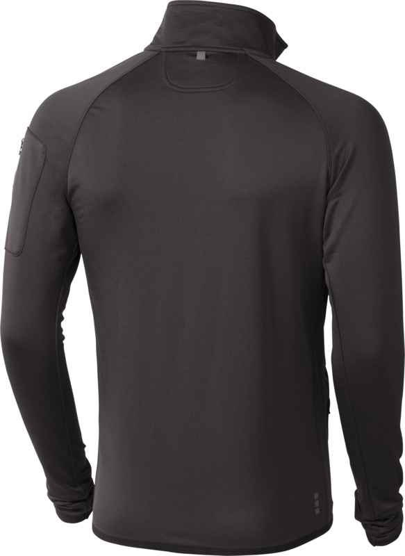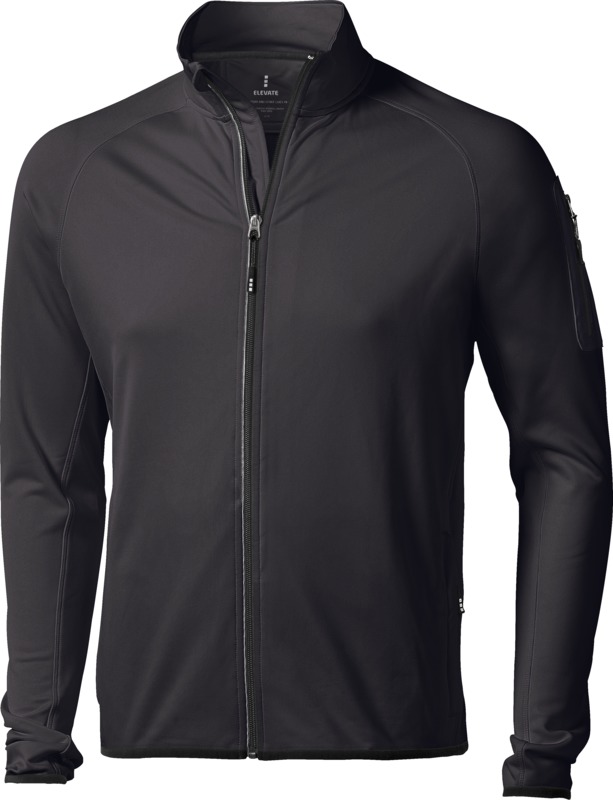 Pánská fleecová bunda na zip bez kapuce, s otvory pro palce, 3 kapsy na zip, kapsa na rukávu, nastavitelné manžety a spodní lem, reflexní proužek kolem hlavního zipu a podél krku, měkce zdrsněná vnitřní strana. 89% polyester, 11% elastan, 245 g/m2.