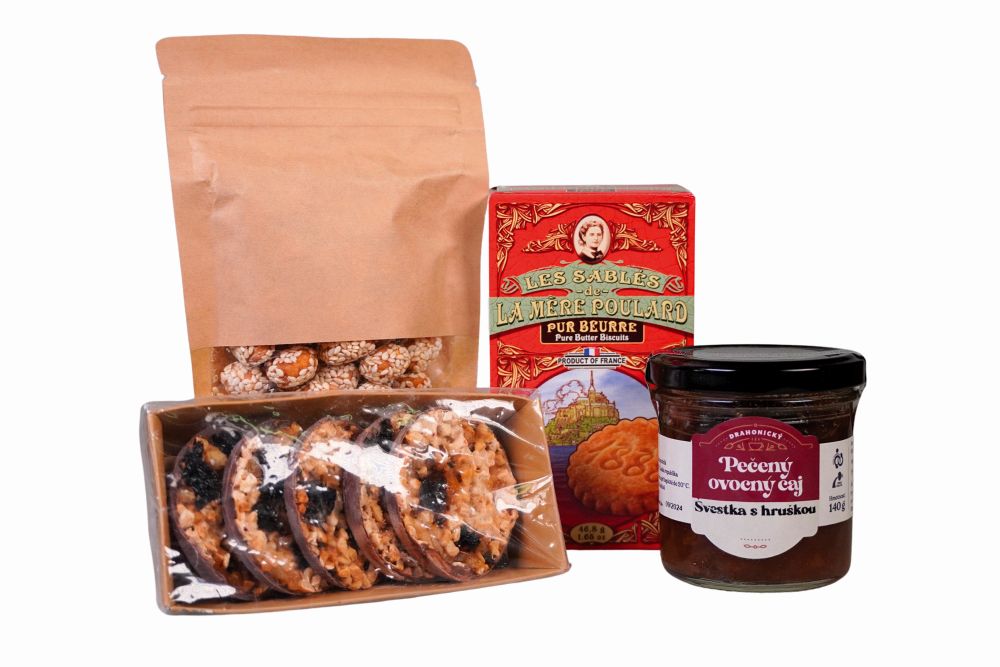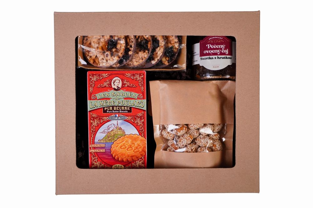 Sada obsahuje: – máslové sušenky La Mére Poulard 47 g – florentýnky marokánky 80 g – arašídy karamelizované se sezamem 50 g – pečený čaj švestka s hruškou 140 g Sada je balena v dárkové krabici s víkem, která je vystlána barevnou papírovou výplní. Do krabice lze vložit komplimentku. Náhrada produktů vyhrazena dle dostupnosti. Termín dodání: 12–14 dnů Minimální odběr: 24 kusů Rozměry: 20,2 × 22,2 × 7 cm.