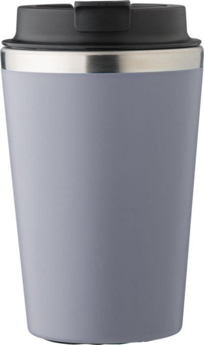 Cestovní hrnek z nerezové oceli a PP, 350 ml. Víčko se skládacím uzávěrem má silikonový těsnící kroužek. Jednotlivě balené v hnědé kartonové krabici. Rozměry: o 8,9 x 15 cm.