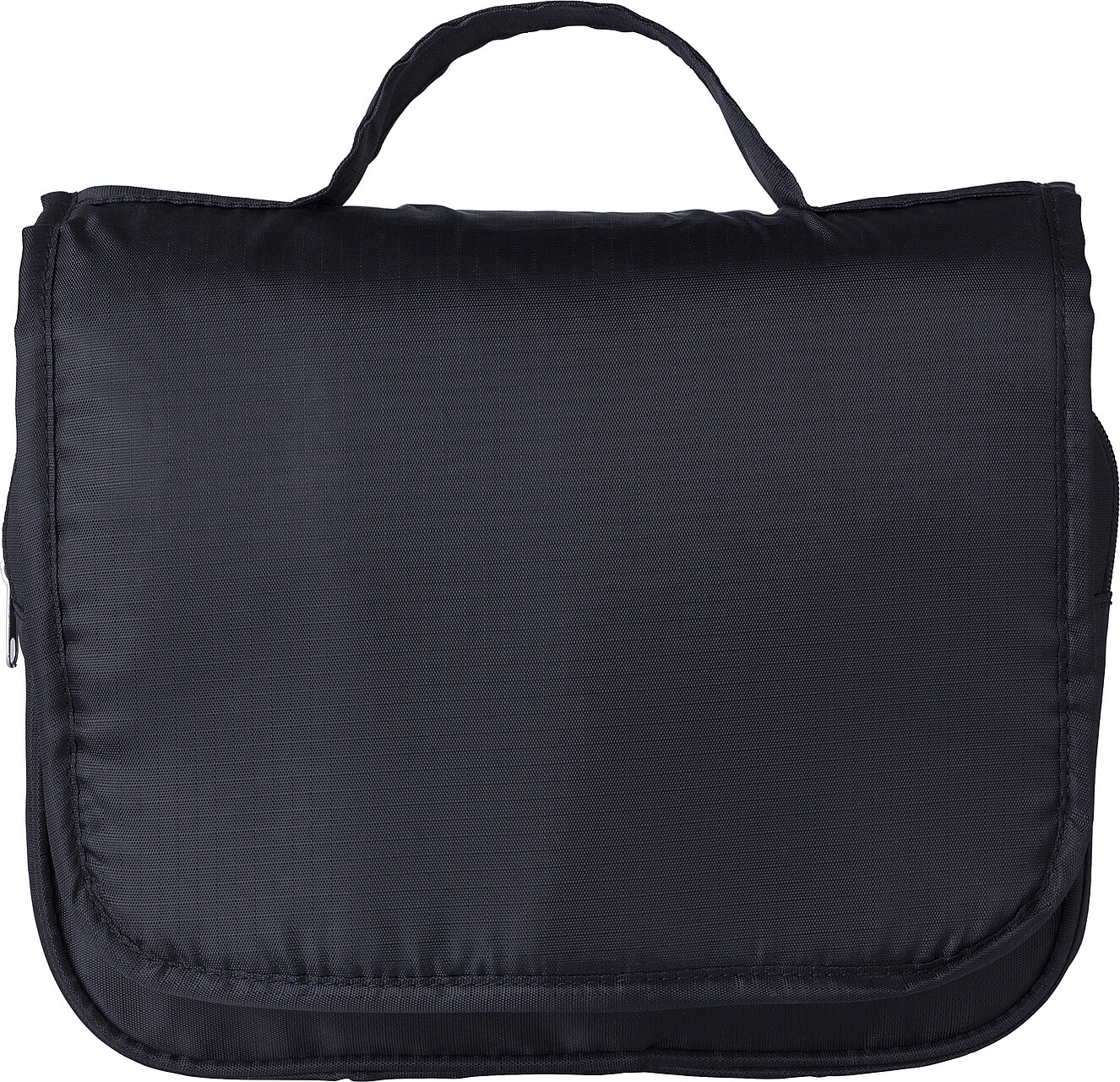 Polyesterová (210D ripstop) cestovní toaletní taška se závěsným háčkem. Kapsa na zip na horní straně při otevření. Jedna velká a jedna malá síťovaná kapsa na zip. Pouzdro na zadní straně. Krátká rukojeť pro přenášení. Rozměry: 23 x 8 x 21 cm
