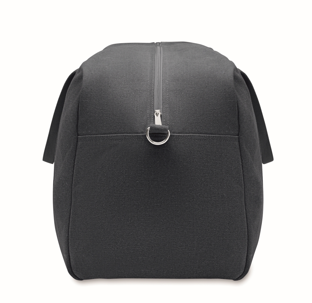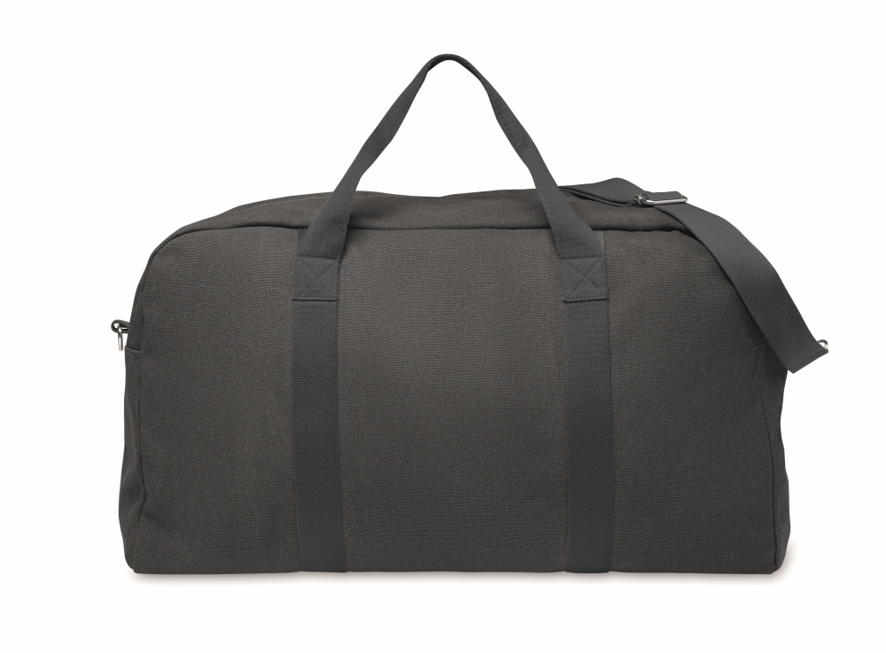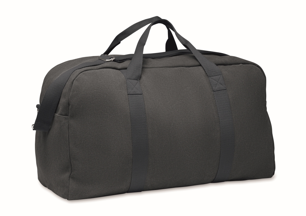 Cestovní taška z recyklovaných tkanin o gramáži 450g (60 % recyklovaná bavlna a 40 % recyklovaný polyester) s nastavitelným a odnímatelným bavlněným popruhem. Rozměry: 57 x 33 x 27,5 cm