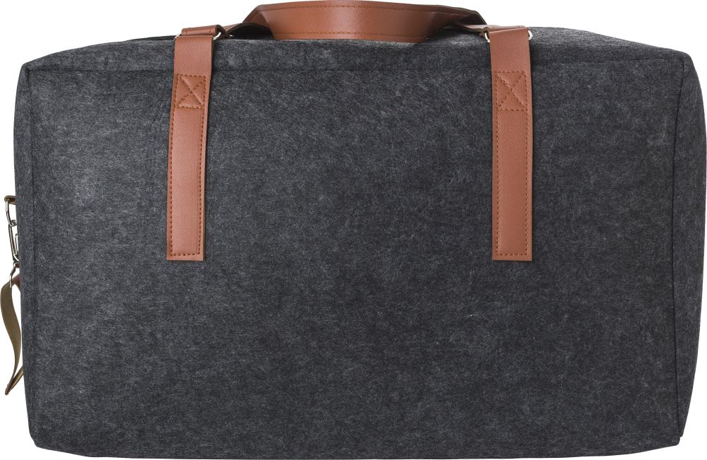 Cestovní taška s detaily a popruhem z umělé kůže. Taška má hlavní oddíl uzavíratelný zipem a malou kapsu bez zipu. Taška je vyrobená z RPET plsti. Rozměry: 53 x 30 x 26 cm
