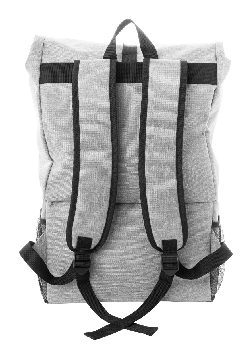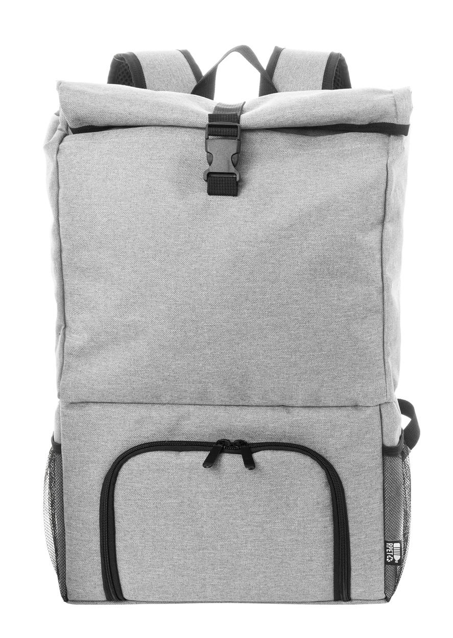 Rolovací chladicí batoh z RPET materiálu s polstrovanou chladicí přihrádkou na jídlo uzavíratelnou na zip. Batoh má hlavní přihrádku uzavíratelnou na sponu, přední kapsu na zip, boční síťované kapsy a posltrované ramenní popruhy. Materiál 600D RPET polyester, PEVA. Rozměry: 30 × 62 × 13 cm.
