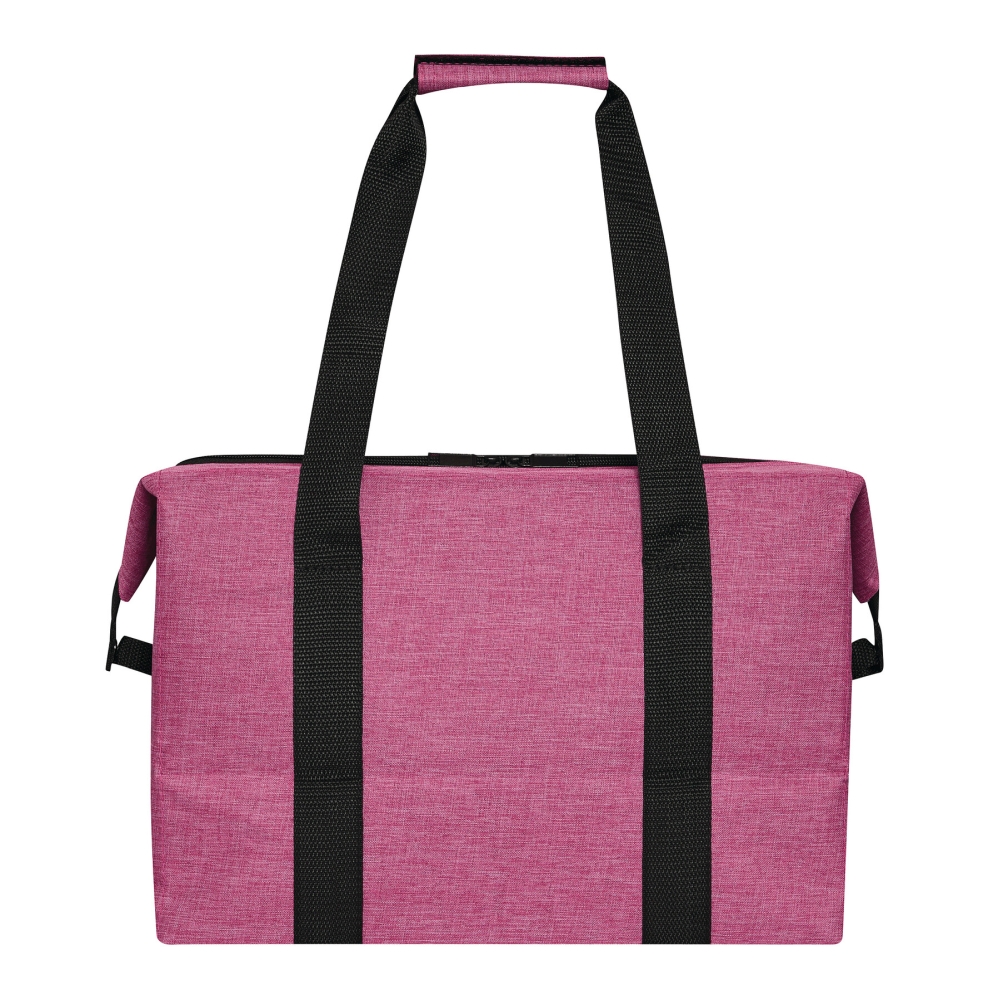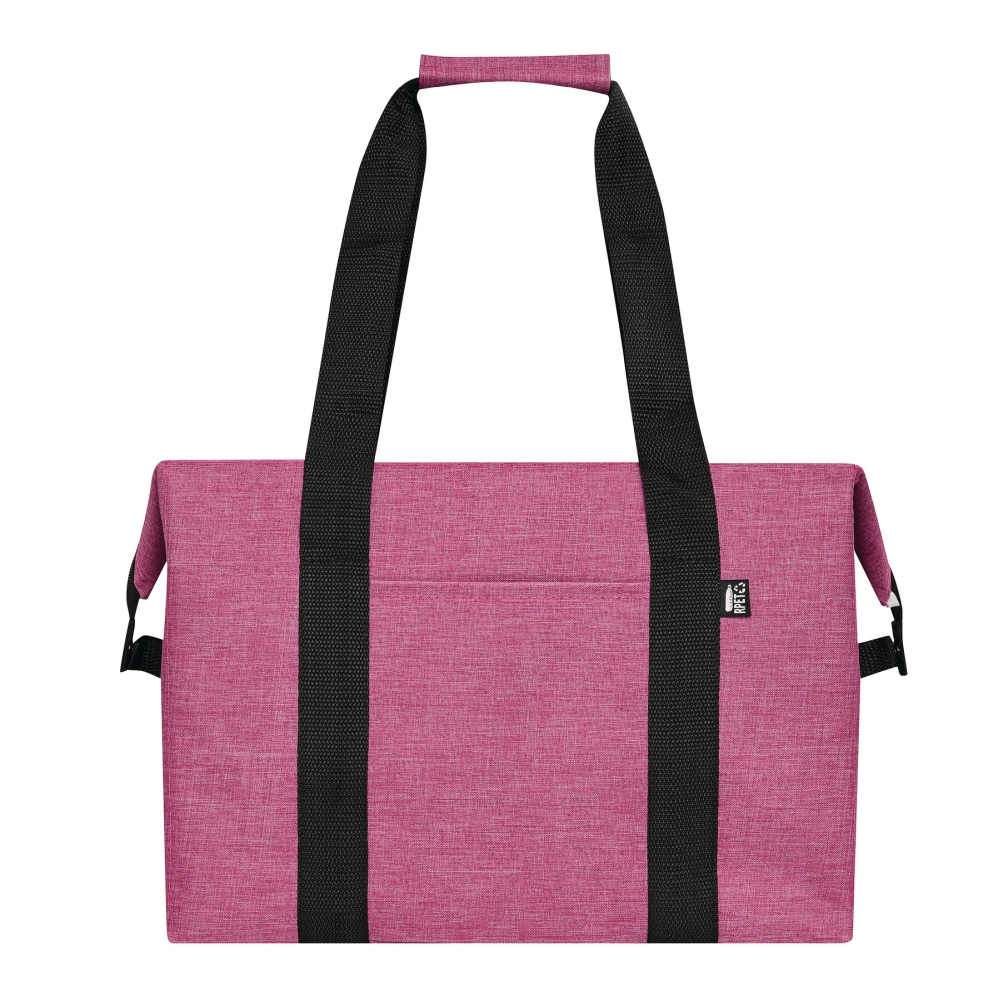 Chladicí taška, vyrobena z recyklovaného plastu (RPET), zateplená hlavní přihrádka s oboucestným zipem, 1 zasouvací kapsa na přední straně, zesílené rukojeti, úložný prostor lze rozšířit odepnutím horních okrajů tašky z popruhu připevněného na každé straně. Rozměry: 58 x 19 x 44 cm