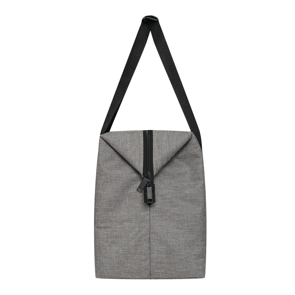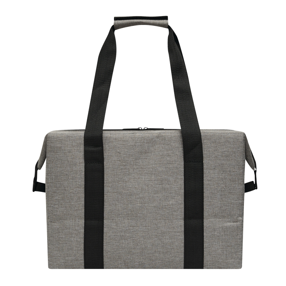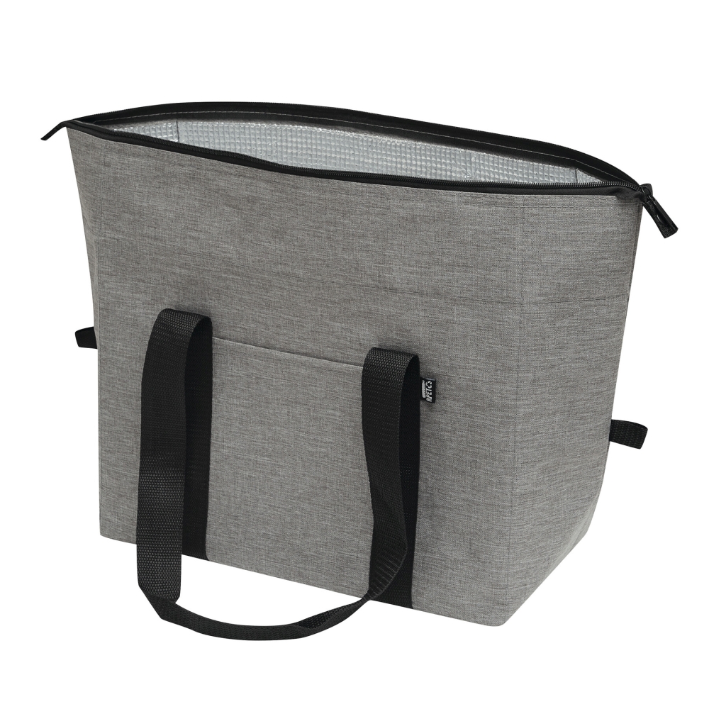 Chladicí taška, vyrobena z recyklovaného plastu (RPET), zateplená hlavní přihrádka s oboucestným zipem, 1 zasouvací kapsa na přední straně, zesílené rukojeti, úložný prostor lze rozšířit odepnutím horních okrajů tašky z popruhu připevněného na každé straně. Rozměry: 56 x 19 x 44 cm