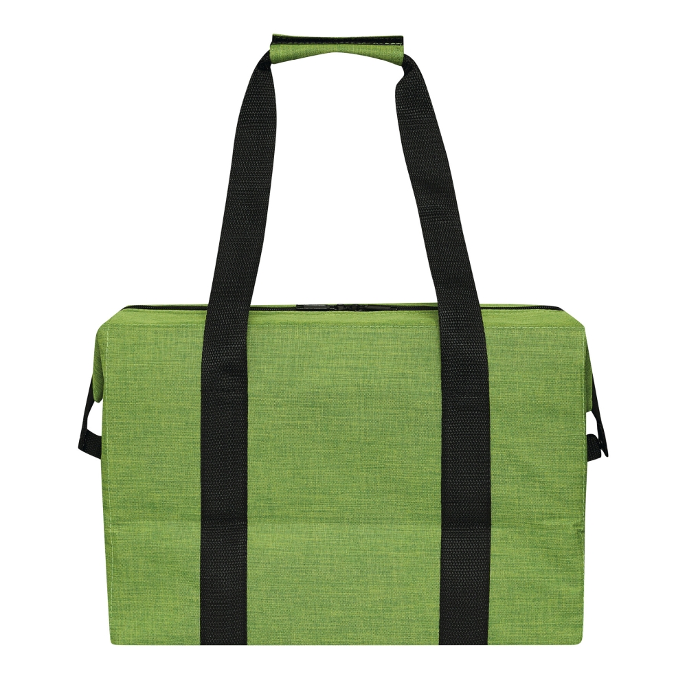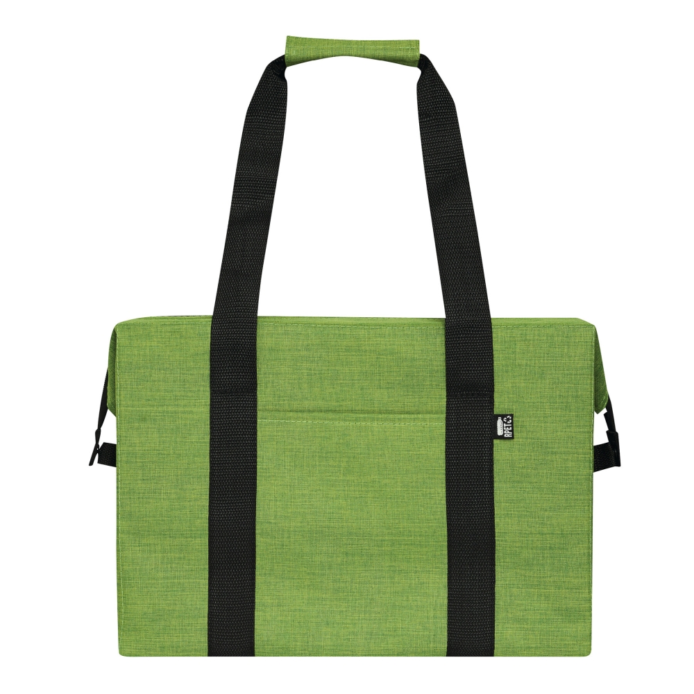 Chladicí taška, vyrobena z recyklovaného plastu (RPET), zateplená hlavní přihrádka s oboucestným zipem, 1 zasouvací kapsa na přední straně, zesílené rukojeti, úložný prostor lze rozšířit odepnutím horních okrajů tašky z popruhu připevněného na každé straně. Rozměry: 59 x 19 x 44 cm