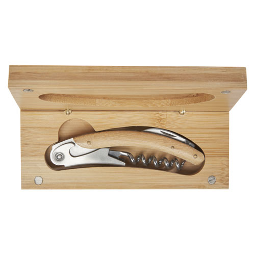 Číšnický otvírák z nerezové oceli s vývrtkou a zatahovacím fóliovým nožem s přírodním bambusem na rukojeti. Použitý bambus se získává a vyrábí v souladu se zásadami udržitelnosti. Rozměry: 14,9 x 3 x 5,9 cm