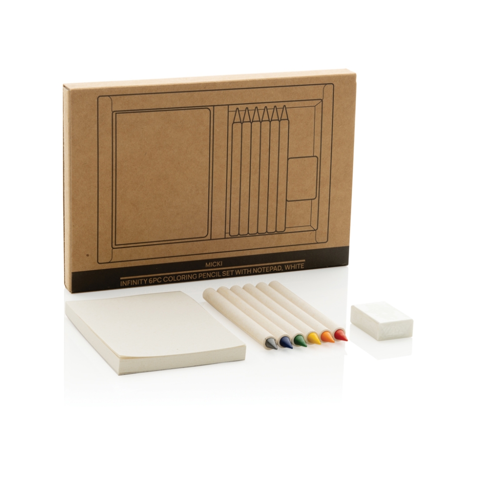 Sada 6 nekonečných pastelek o délce 9 cm, gumy a poznámkového bločku s 50 listy. Pastelky jsou vyrobeny z 69% recyklovaného mléčného kartonového papíru s certifikací GRS a mají hladký grafitový hrot pro snadné barvení. Tyto pastelky mají kreslicí stopu až 20 000 metrů, což je asi 100 × více než u běžných pastelek. Vytvářejí hladkou linku a snadno se gumují. Dodáváno v ekologicky šetrném balení. Rozměry: 11,5 × 17 × 1,5 cm.
