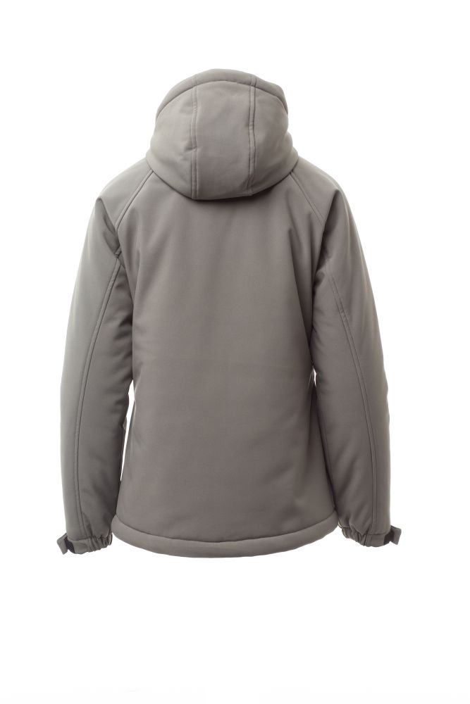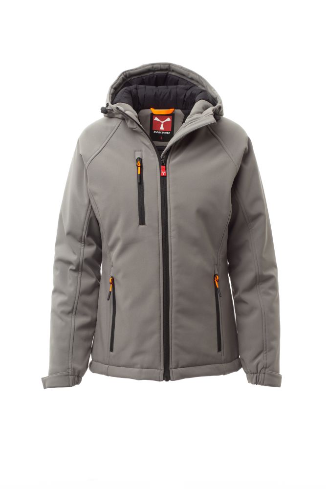 WP 8000 mm H2O, WVT 5000 g/m2 24h. Dámský zateplený softshell, zapínání na zip s kovovým jezdcem „semi-auto lock“ a přizpůsobeným taháčkem. Neodnímatelná kapuce se stahovací šňůrkou. Elastické stahovací manžety na suchý zip. Dvě boční kapsy a jedna kapsa na hrudi na zip. Fluorescenční taháčky. Dvě vnitřní kapsy: jedna tvarovaná na zip a jedna na tablet se zapínáním na suchý zip. Spodní část stažitelná pomocí přizpůsobených zarážek.