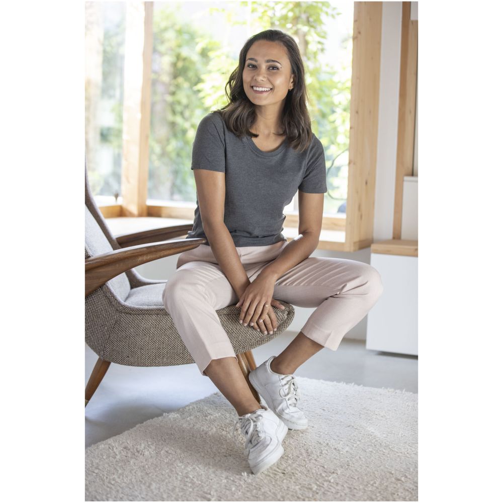 Dámské tričko s krátkým rukávem, značka Elevate. Tričko má kulatý výstřih, plochý žebrový lem kolem výstřihu a odtrhávací štítek pro větší pohodlí. Boční švy a zúžený pas pro zeštíhlující outfit. Jednolícní žerzej 100% bavlna, 150 g/m2.