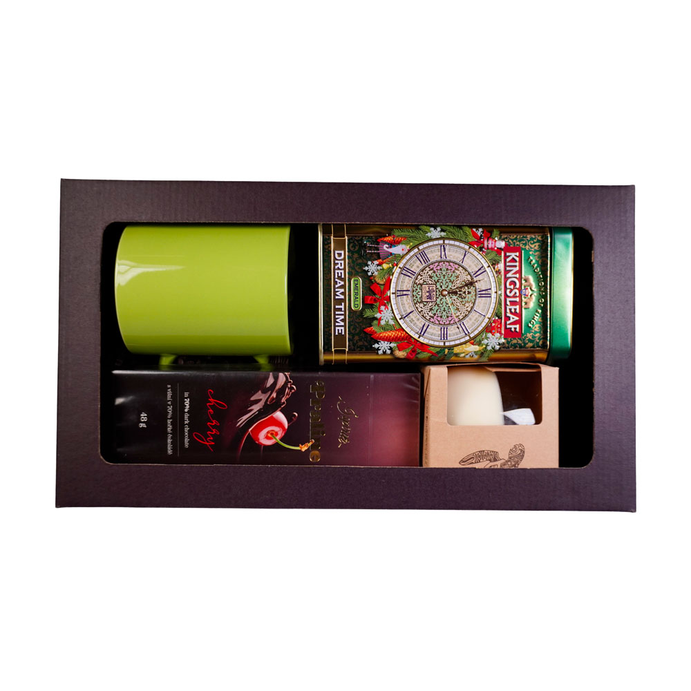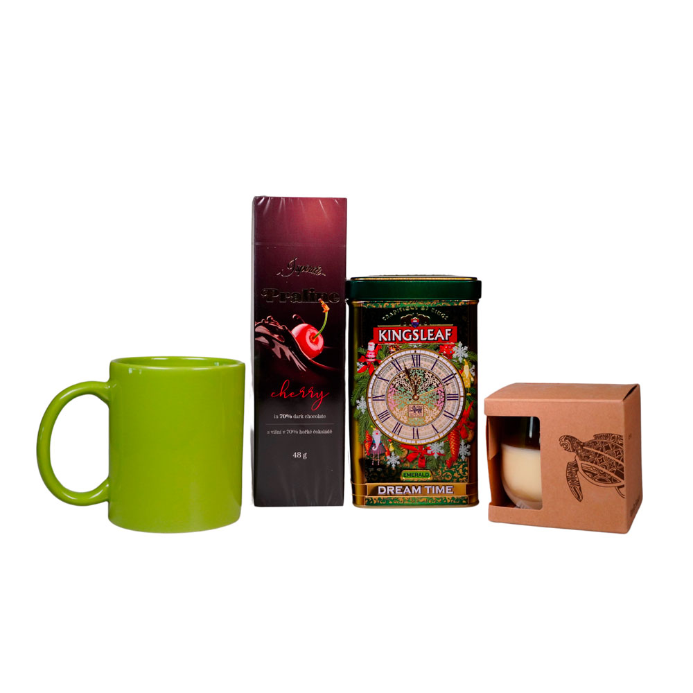 Sada obsahuje: - čokoládové pralinky dle aktuální nabídky - hrnek zelený - svíčka zelená - sypaný čaj „bylinnný ochránci“ 60 g Sada je balena v dárkové krabici s víkem, která je vystlána barevnou papírovou výplní. Do krabice lze vložit komplimentku. Náhrada produktů vyhrazena dle dostupnosti. Termín dodání: 12-14 dnů. Minimální odběr: 24 kusů. Rozměry: 19 x 33 x 10 cm.