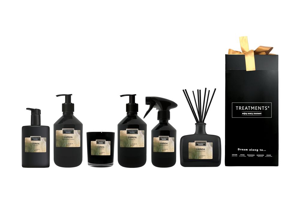 Luxusní dárková sada s vůní Samoa značky Treatments® v elegantní krabičce s mašličkou. Sada obsahuje vonnou svíčku, difuzér 200 ml, interiérovou vůni 300 ml, mýdlo na ruce 200 ml, šampon obsahujicí kondicioner 300 ml a sprchový gel 300 ml. Rozměry: 14 x 14 x 28 cm.